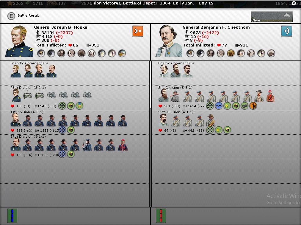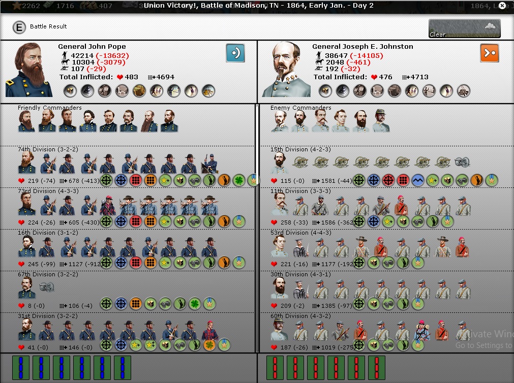 After taking New Years Day off, action became very hot on January 2, 1864 as General Pope's corps fought a battle against Joe Johnston at Madison, Tennessee. General Thomas' exhausted corps joined in, further decimating its divisions, as did a Wisconsin cavalry division under General Gregg, which also took heavy losses. Pope brought 42,000 to the field, losing 14,000 while Johnston brought 39,000 and lost 14,000. Granger, Wilder, and Nelson performed very well for Pope, as did weakened divisions under Reno and Rousseau. Breckenridge and an artillery division under McCulloch performed well under Johnston, while Confederate General Major's division was decimated.