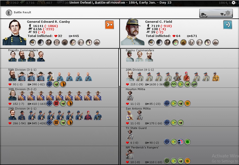On January 13, General Canby's force attacked Houston from Galveston and were defeated in a battle with General Field. Field had a number of texas militia regiments and a division under Baylor. Canby's force consisted of a mized militia and mounted partisan divisions under caldwell, a cavalry and mounted infantry division under Carson, and an infantry division under Carleton.