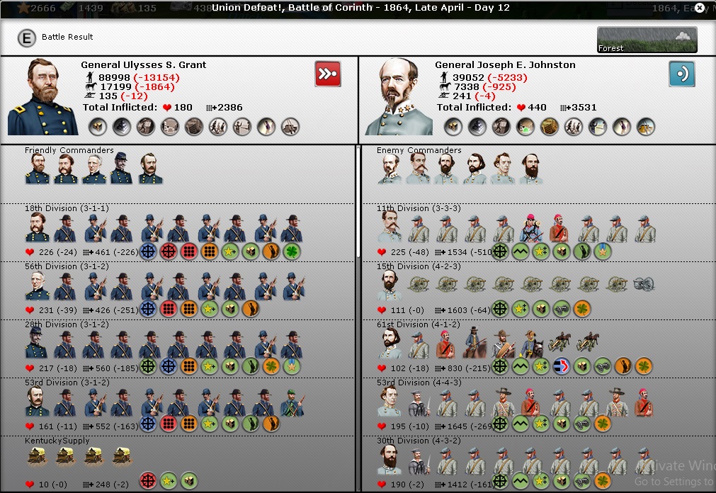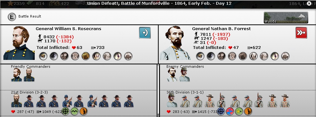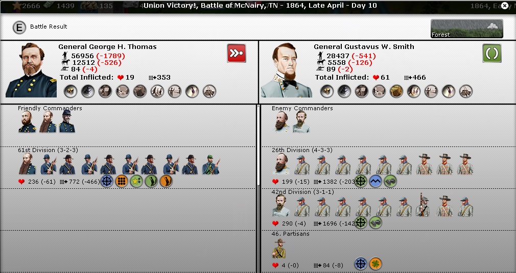 On March 20th, General Thomas' corps followed up the victory at Memphis, attacking Johnston's force at Hardemon County with divisions under Logan, Blair, Stone, and Nelson. Divisions under McCulloch, Edmund Smith, Hampton, and Thompson were retreating under Johnston. Both forces lost about 5000, But with the entire force of Grant's now 100,000+ army behind Thomas, Johnston's force immediately retreated, taking huge losses [63 hits] during the retreat.