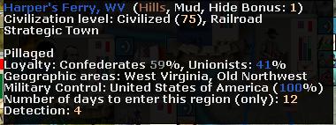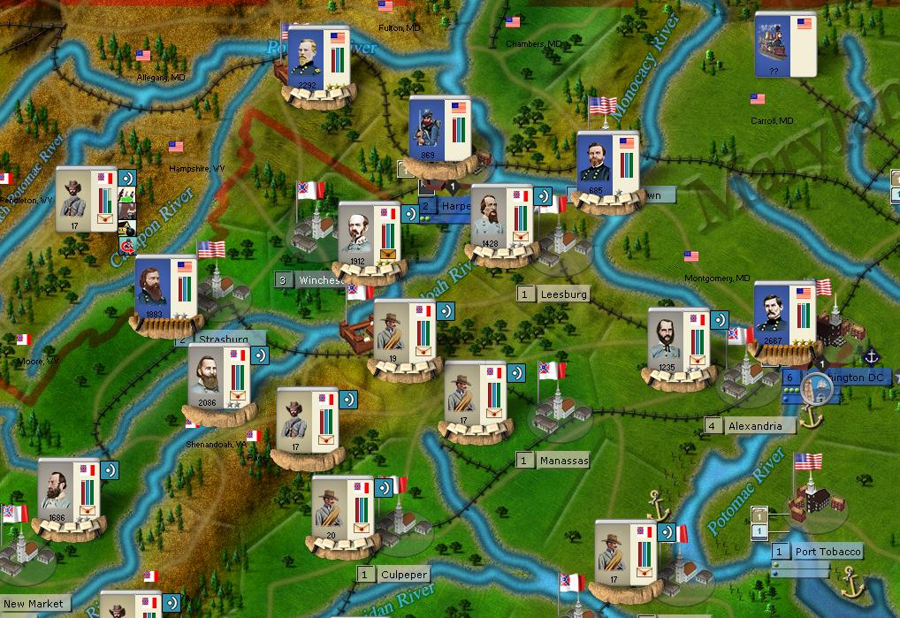 - There is a weakness in the Union supply line in Harper's Ferry and Frederick regions. No need to take the cities, I just need to gain sufficient MC to prevent the flow of supply to pass through one of these regions.