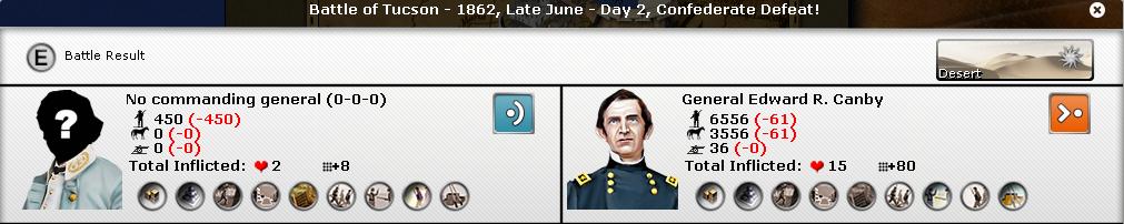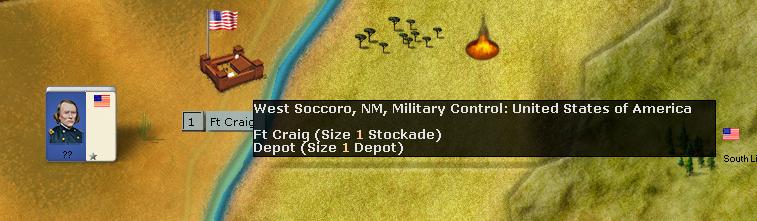 Tucson should fall very quickly into Union hands. I'm improving a defense force in East Dona Ana to try to keep as long as possible El Paso. I have also destroyed or I'm in control of most of the stockades : I want to isolate as much as possible the towns of New Mexico to limit the supply available and, consequently, the size of the force the Union can build there.