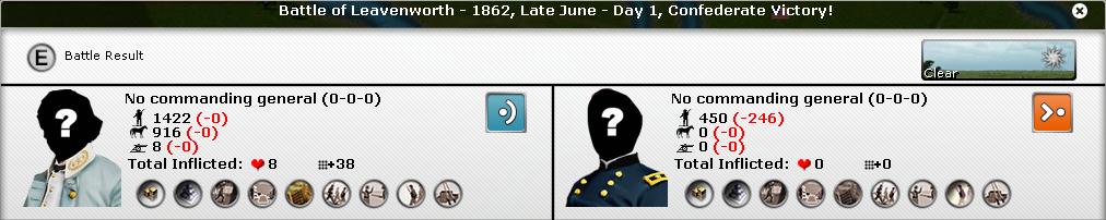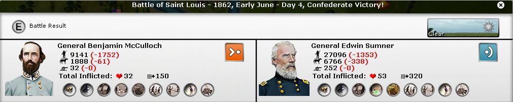 The surprise came from Saint-Louis (MO) : I moved McCulloch into the region to besieged the city and a first battle happened with Sumner. I suppose that GrayFox has moved part of the garrison out of the city this turn.