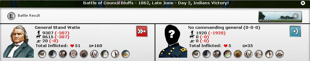 - Stand Watie will try to capture Council Bluffs and, if successfull, will move to Des Moines next turn. By capturing these two strategic towns I will compensate for the loss of Tucson and Winchester. As already written previously, this is only possible because GrayFox is not fighting in this area.
