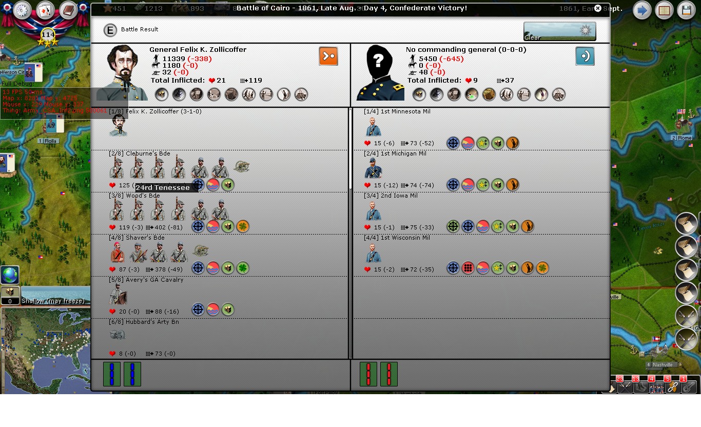 After controlling Charlston last turn, I sent an amphibious Zollicoffer leading a changed Army of Tennessee by water to Cairo. This change is a somewhat big deal, as I've gone with brigades from Shiloh to fill Zollicoffer's ranks, and thus his force is stronger than in the game, but there isn't a close by equivalent strengthened army (except in St. Louis, which the player may tend to send towards Southwestern Missouri). It will take a few tests to see if this is unbalanced or not. For this game, Zollicoffer won some battles, but didn't finish off the garrison, or at least not yet.