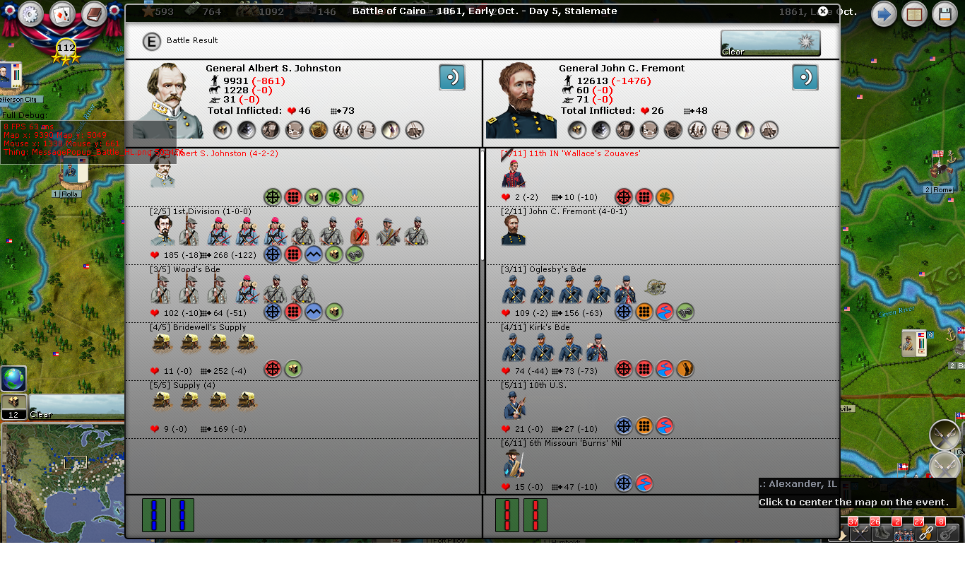 September and October were a bit slow, except in Cairo. I left Johnston on defensive, as I saw Fremont approach and had plenty of supply. I figured I'd be able to beat Fremont, who arrived in early October. Tragically, on October 5, Albert Sidney Johnston was killed along with 860 men. Polk arrived October 15 and helped finish off the garrison.
