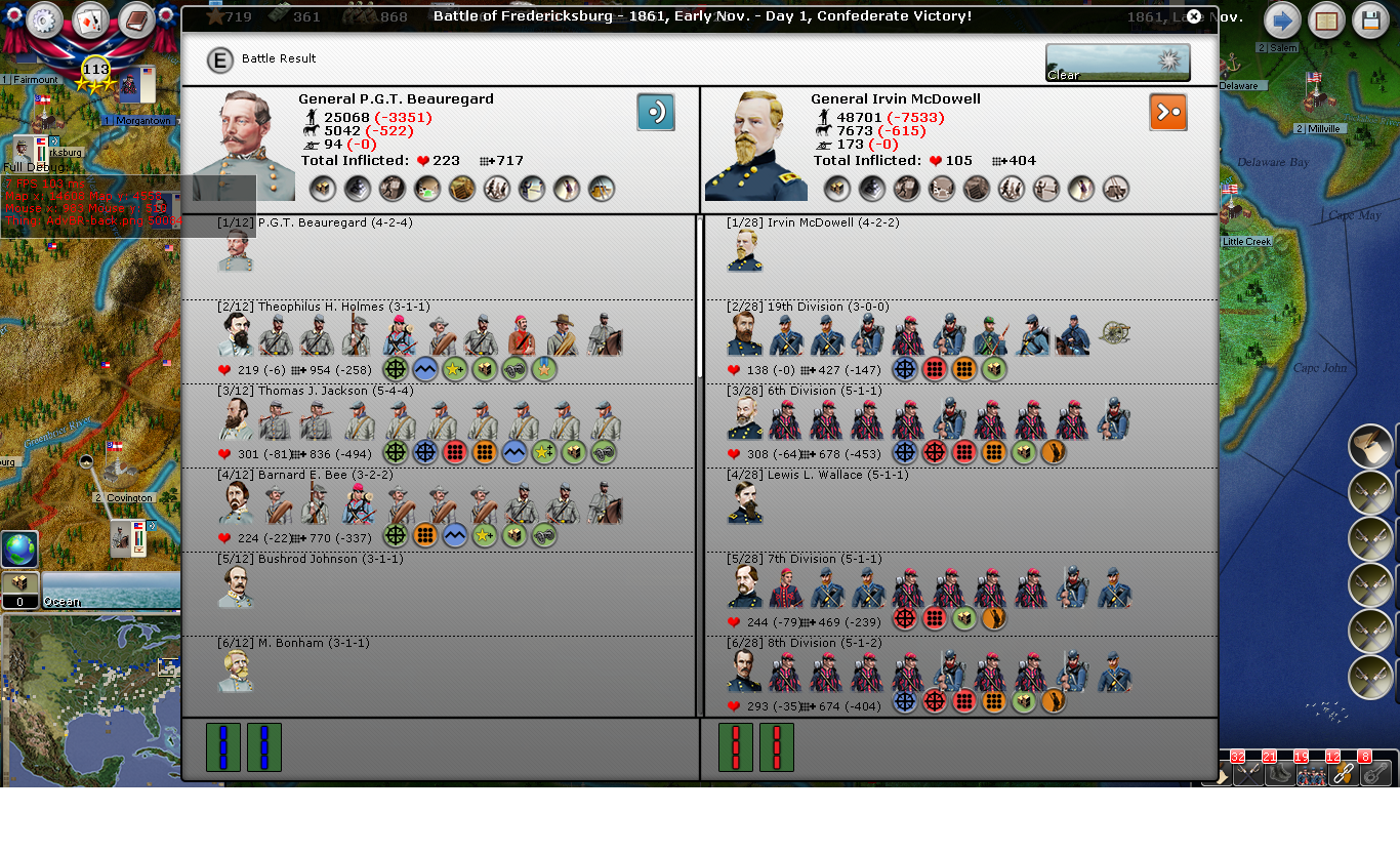 In early November McDowell attacked Beauregard at Fredericksburg. Mcdowell had just under 2:1 forces involved and lost just over 2:1, being repelled violently by the confederates. Holmes and Jackson were commended in command of their divisions.