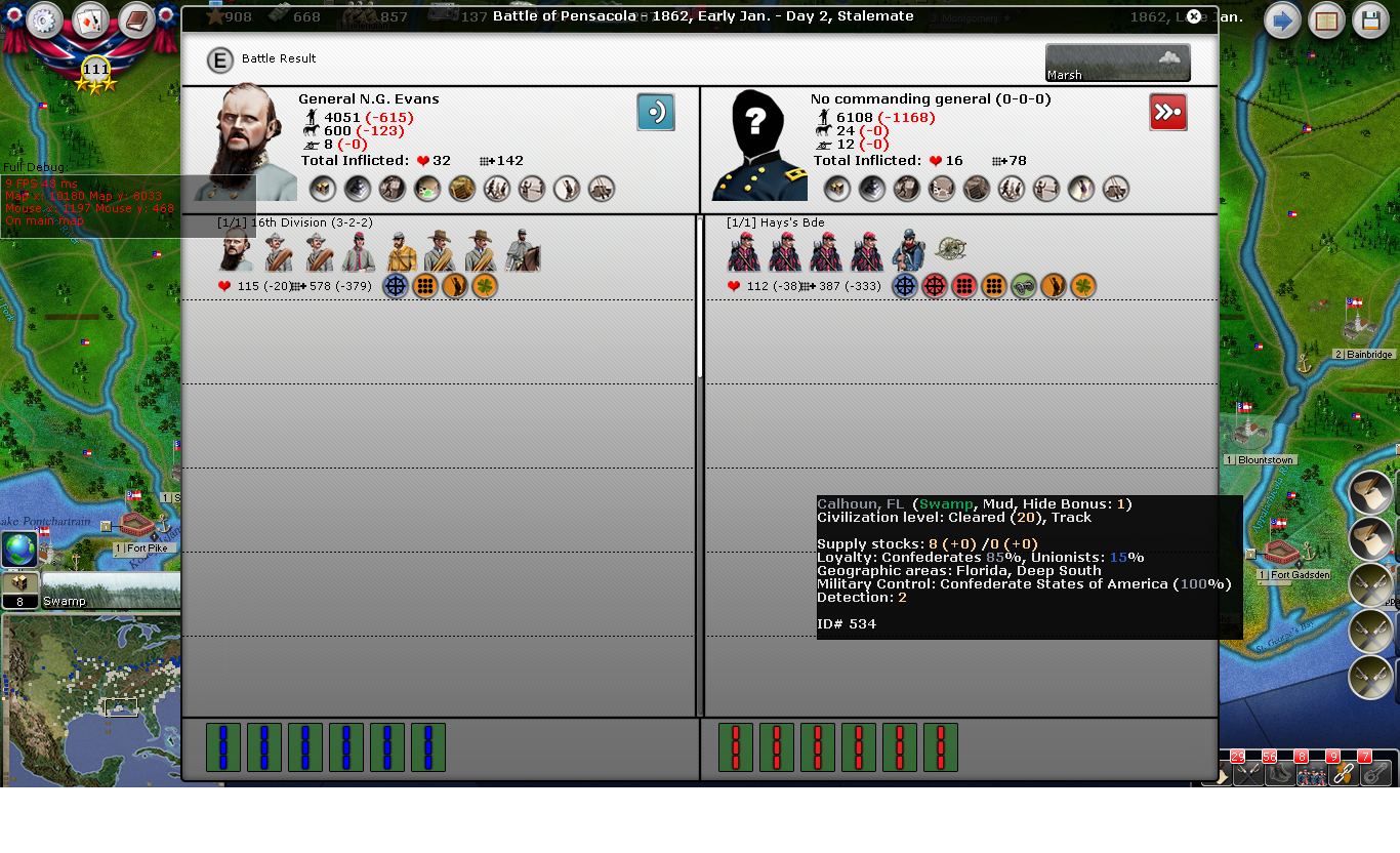 Also in early January, the Union began its customary coastal raids, this time in Pensacola. Evan's had little problem with this initial force, but will continue to struggle with this vector of invasion for the coming months.
