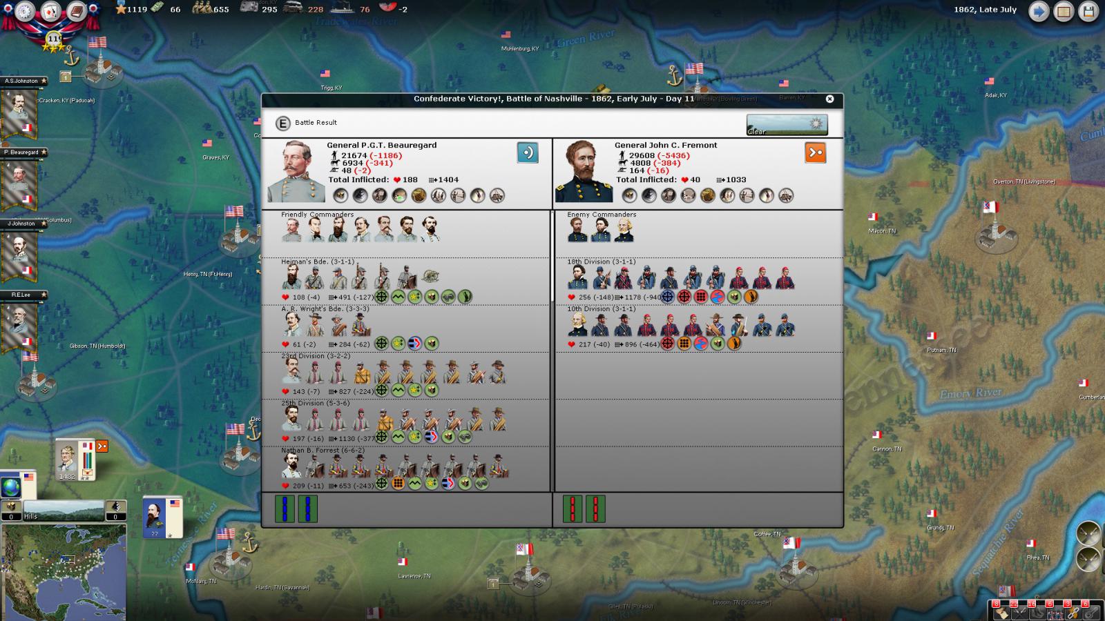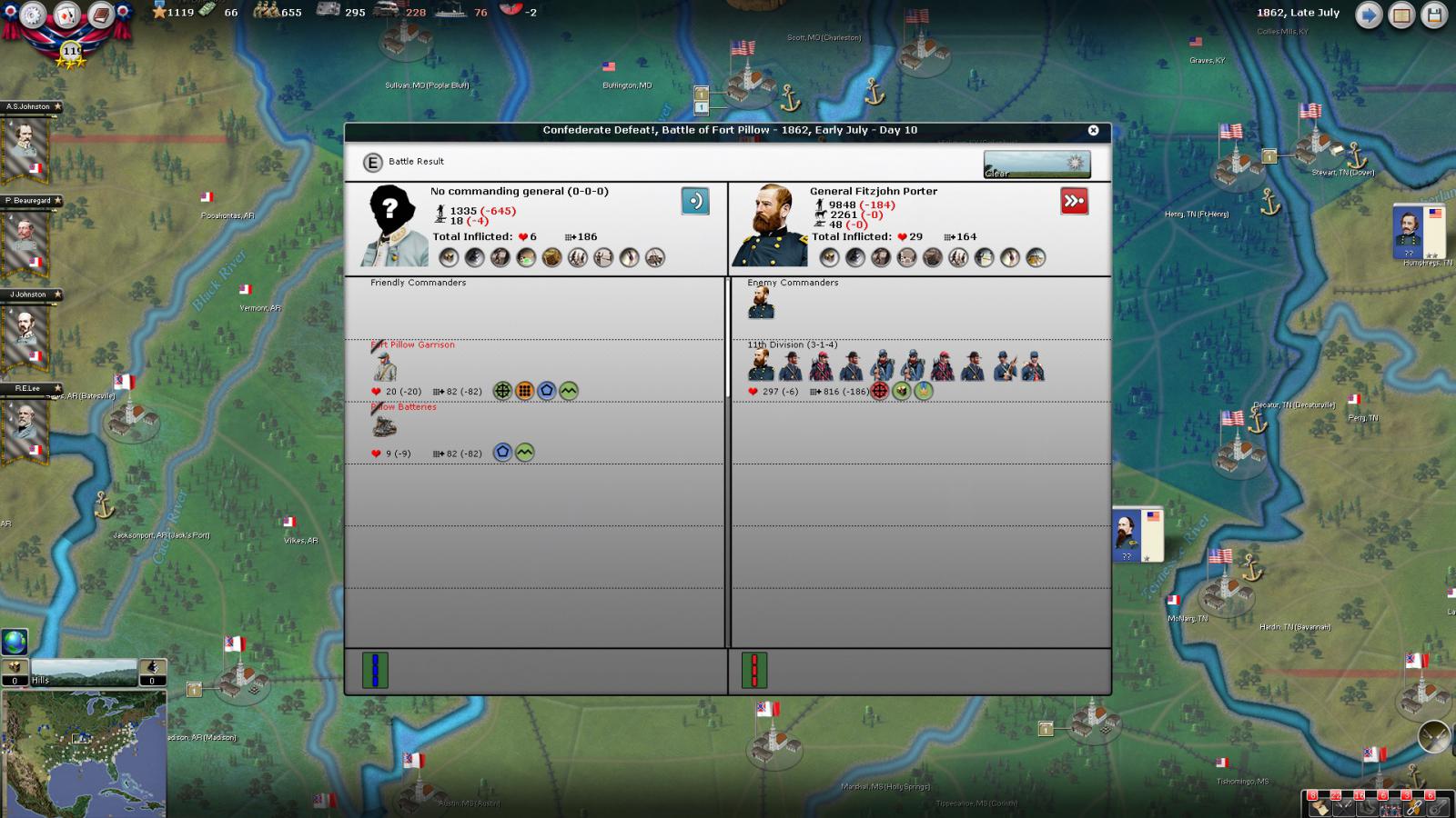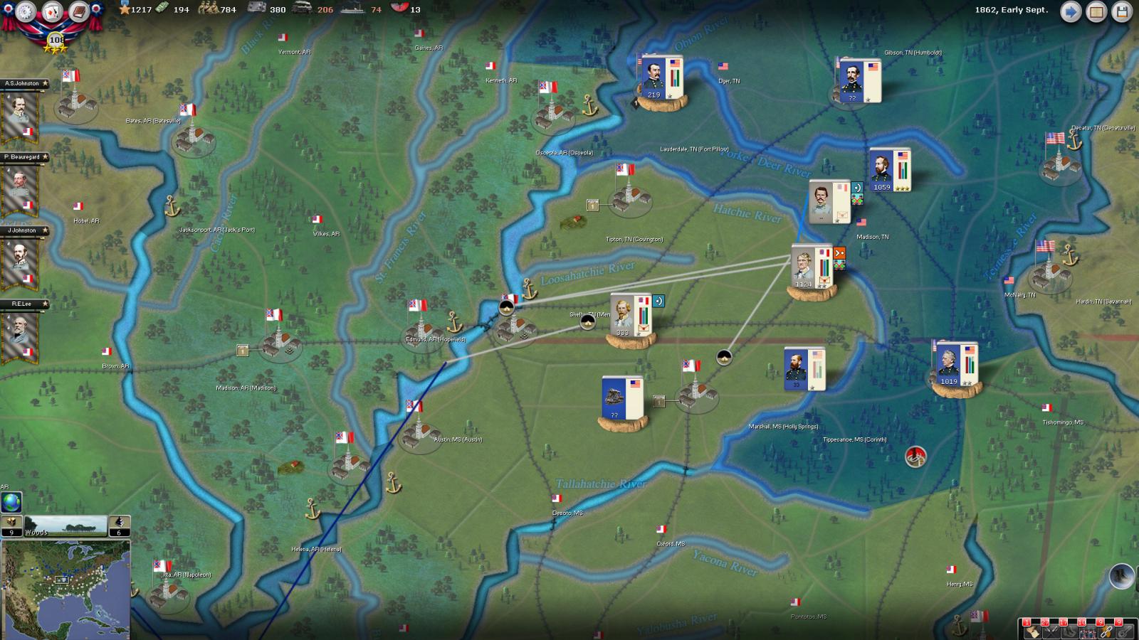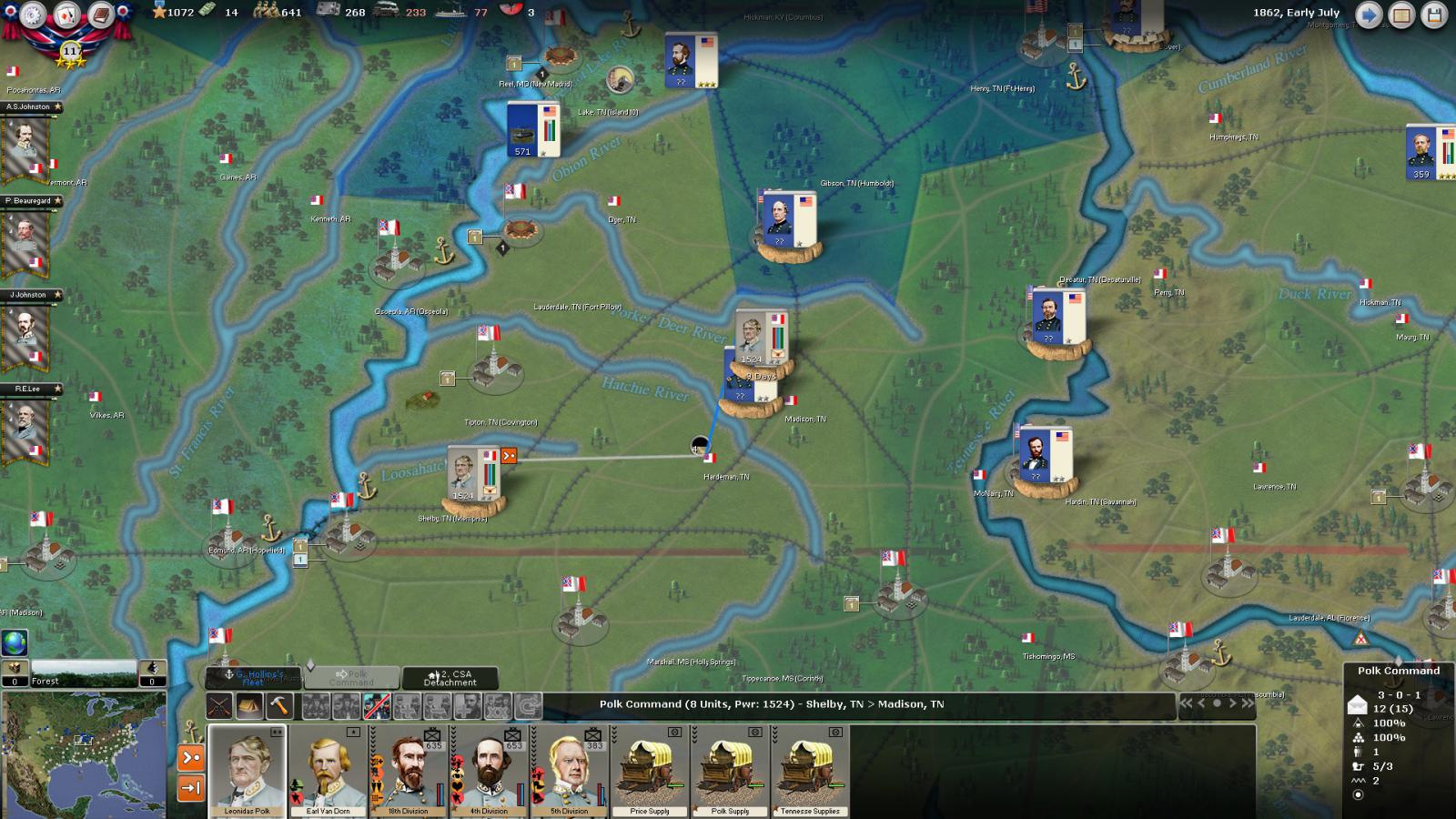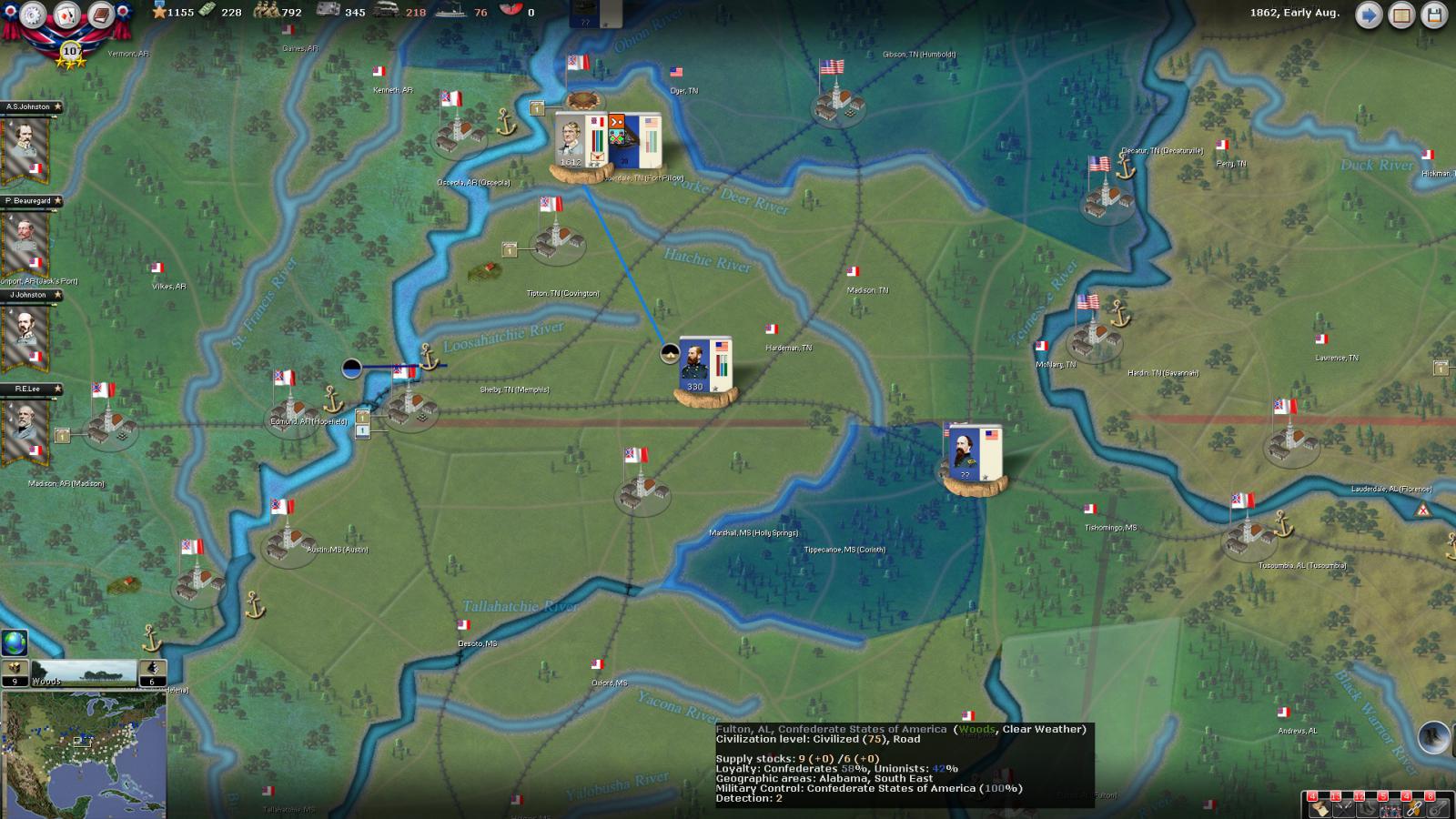 Mickey3D wrote:If I understand well the print screen of Kentucky, Polk is leading a 1111 force in Fort no 10 and you have given him a move order to Memphis. But he has a diagonal Brown line in the top right corner meaning there is a unit that can't move in his stack...