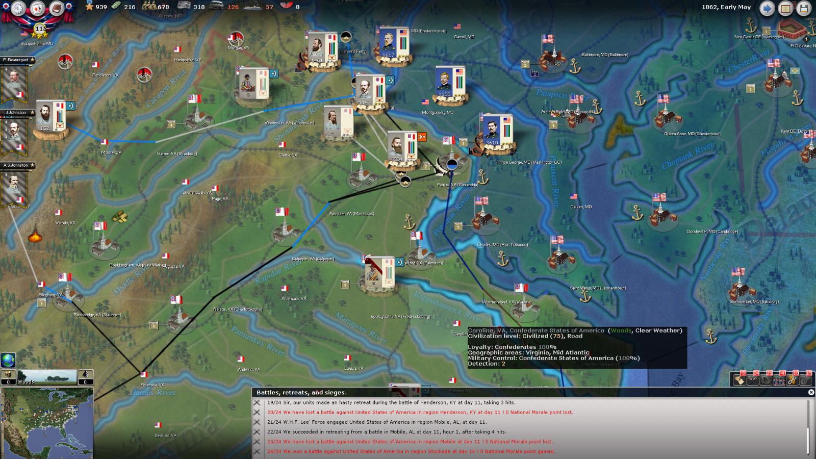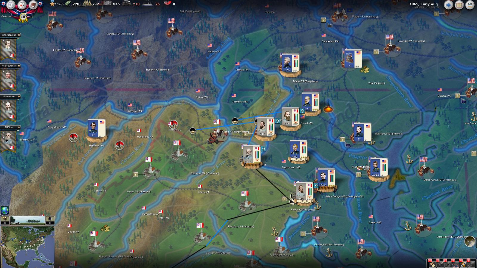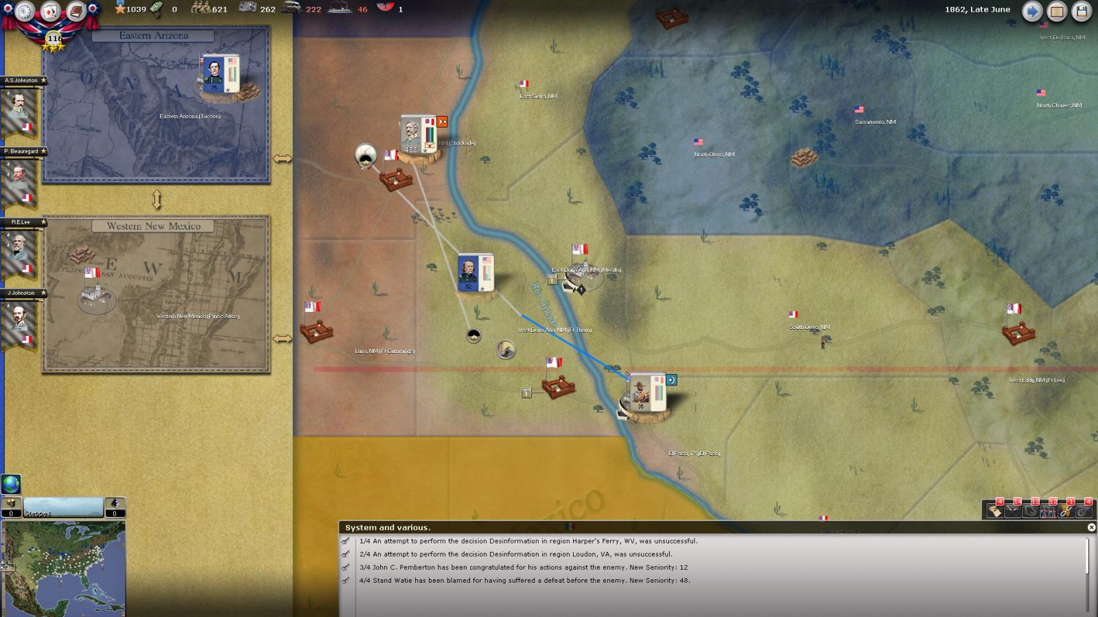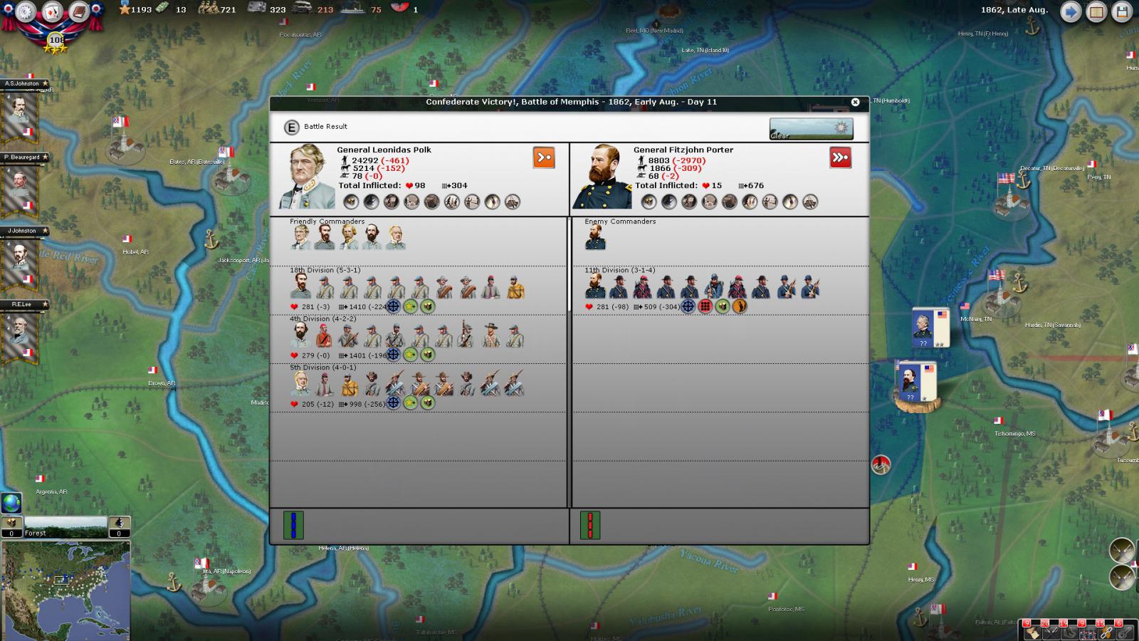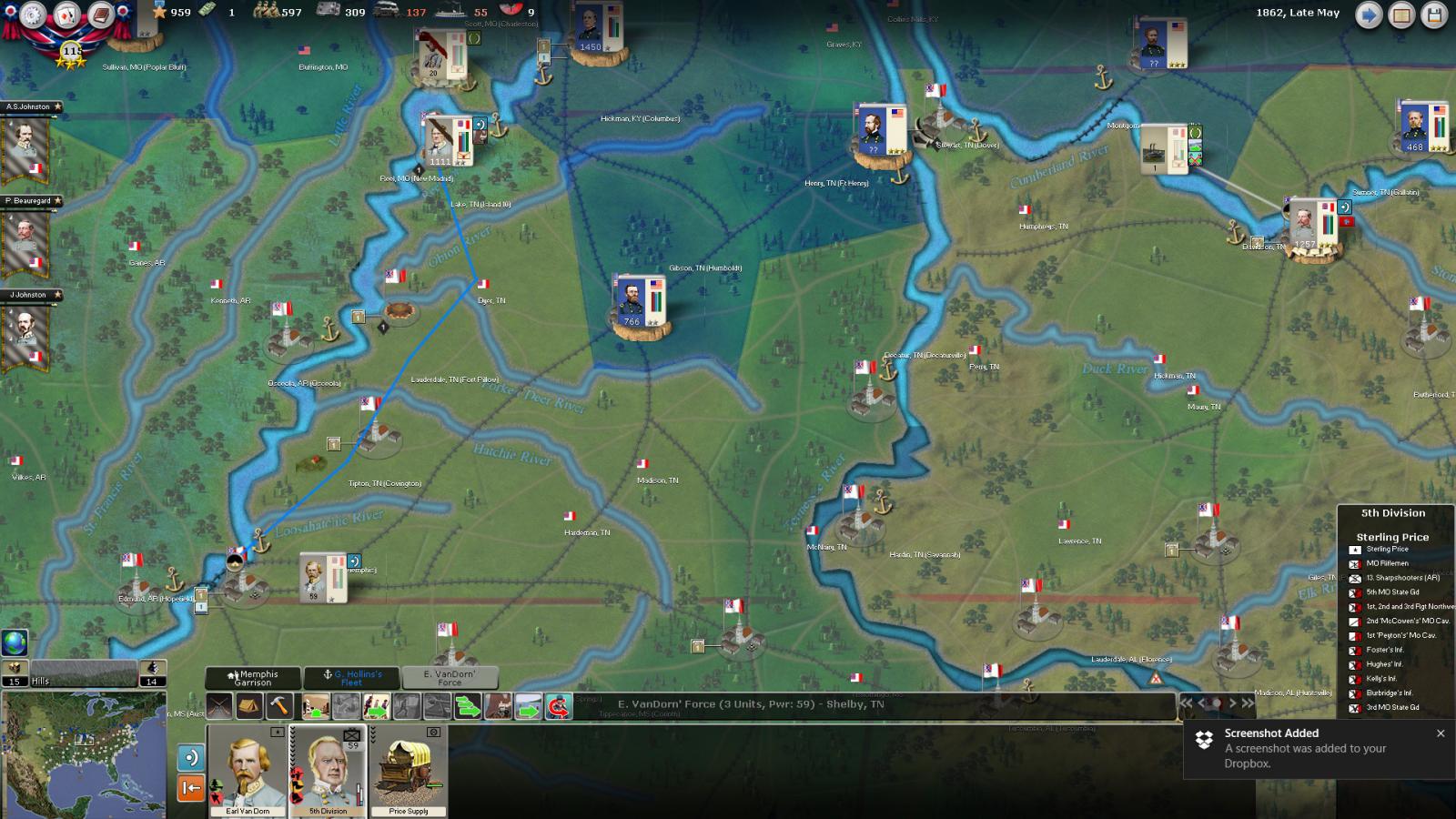 Mickey3D wrote:If I understand well the print screen of Kentucky, Polk is leading a 1111 force in Fort no 10 and you have given him a move order to Memphis. But he has a diagonal Brown line in the top right corner meaning there is a unit that can't move in his stack...