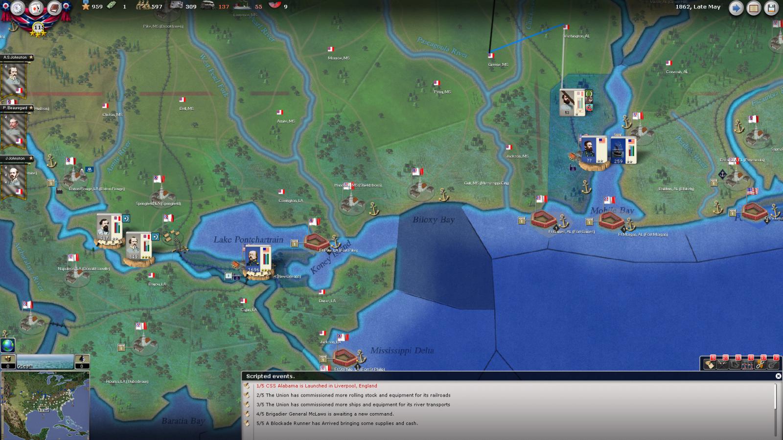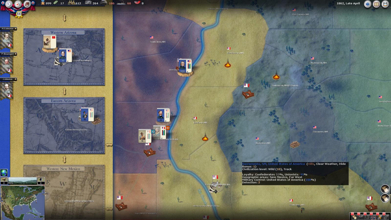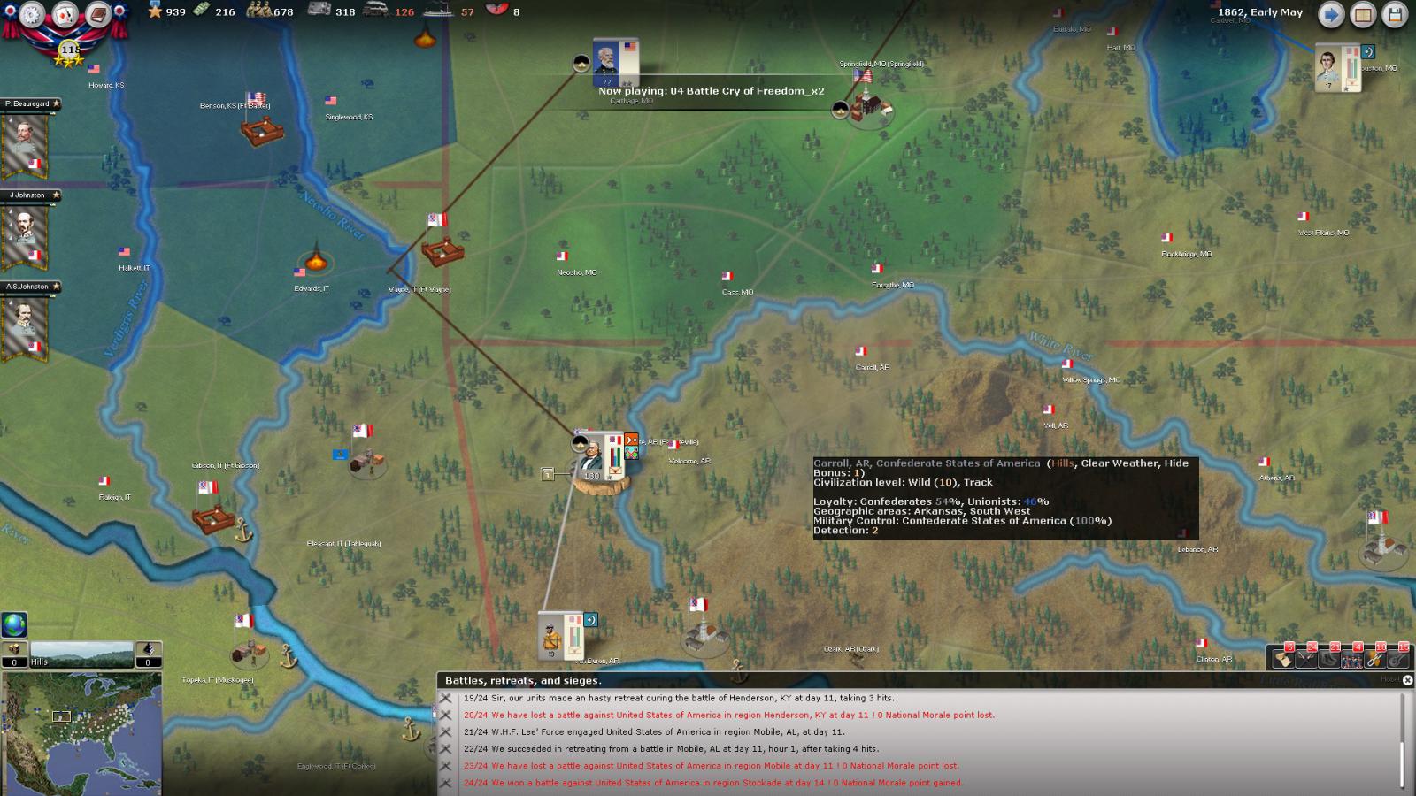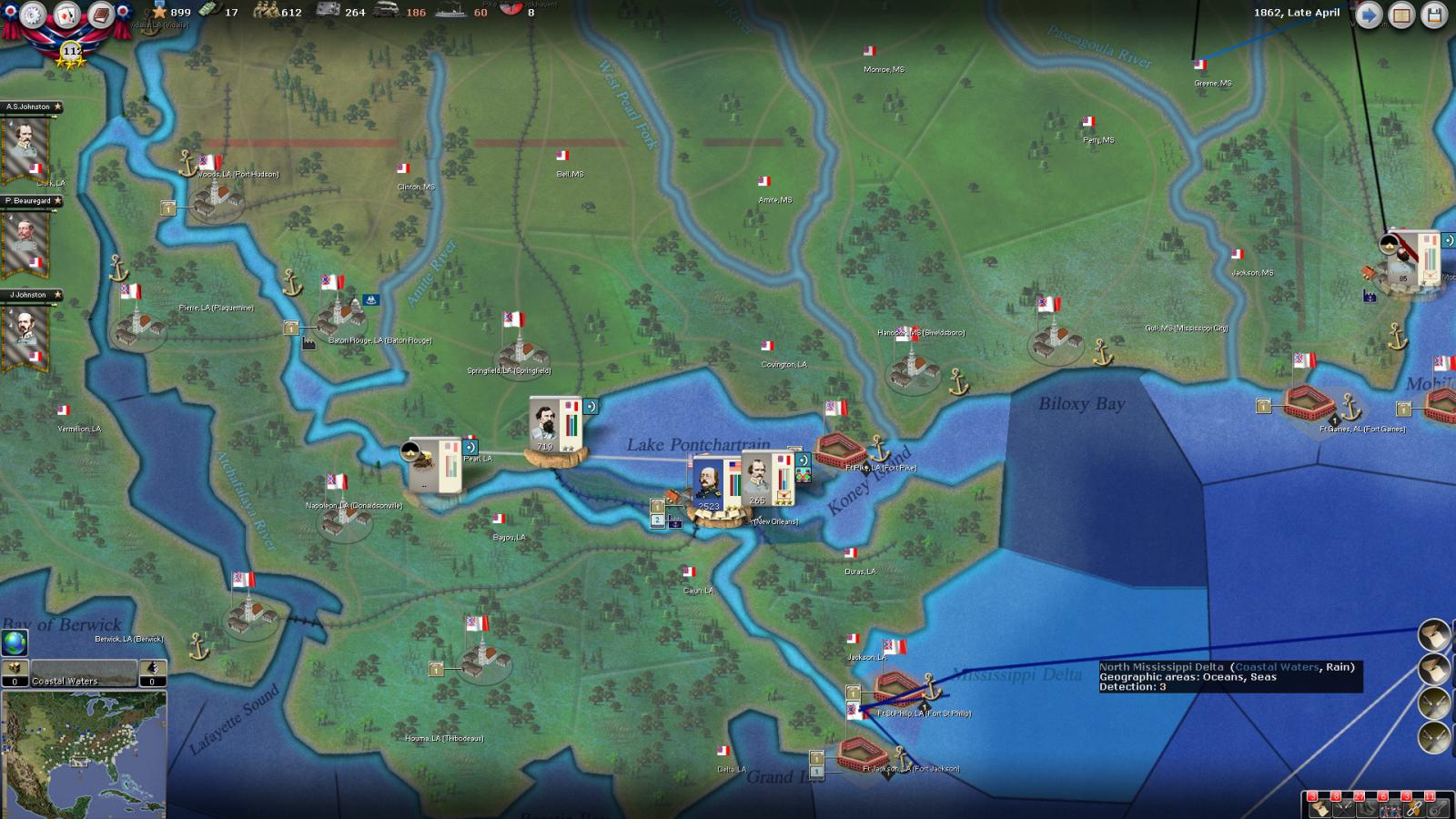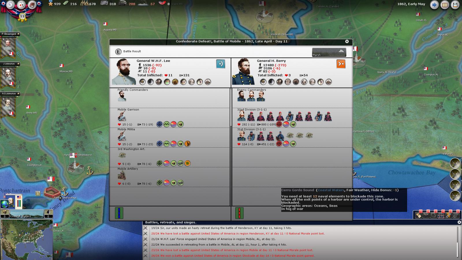 Mickey3D wrote:If I understand well the print screen of Kentucky, Polk is leading a 1111 force in Fort no 10 and you have given him a move order to Memphis. But he has a diagonal Brown line in the top right corner meaning there is a unit that can't move in his stack...