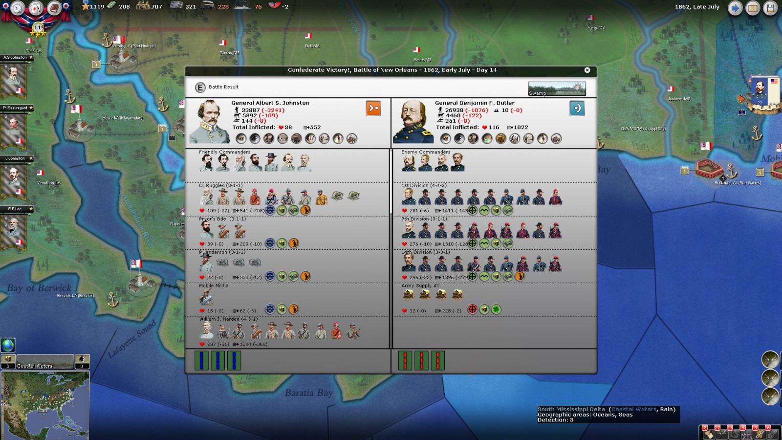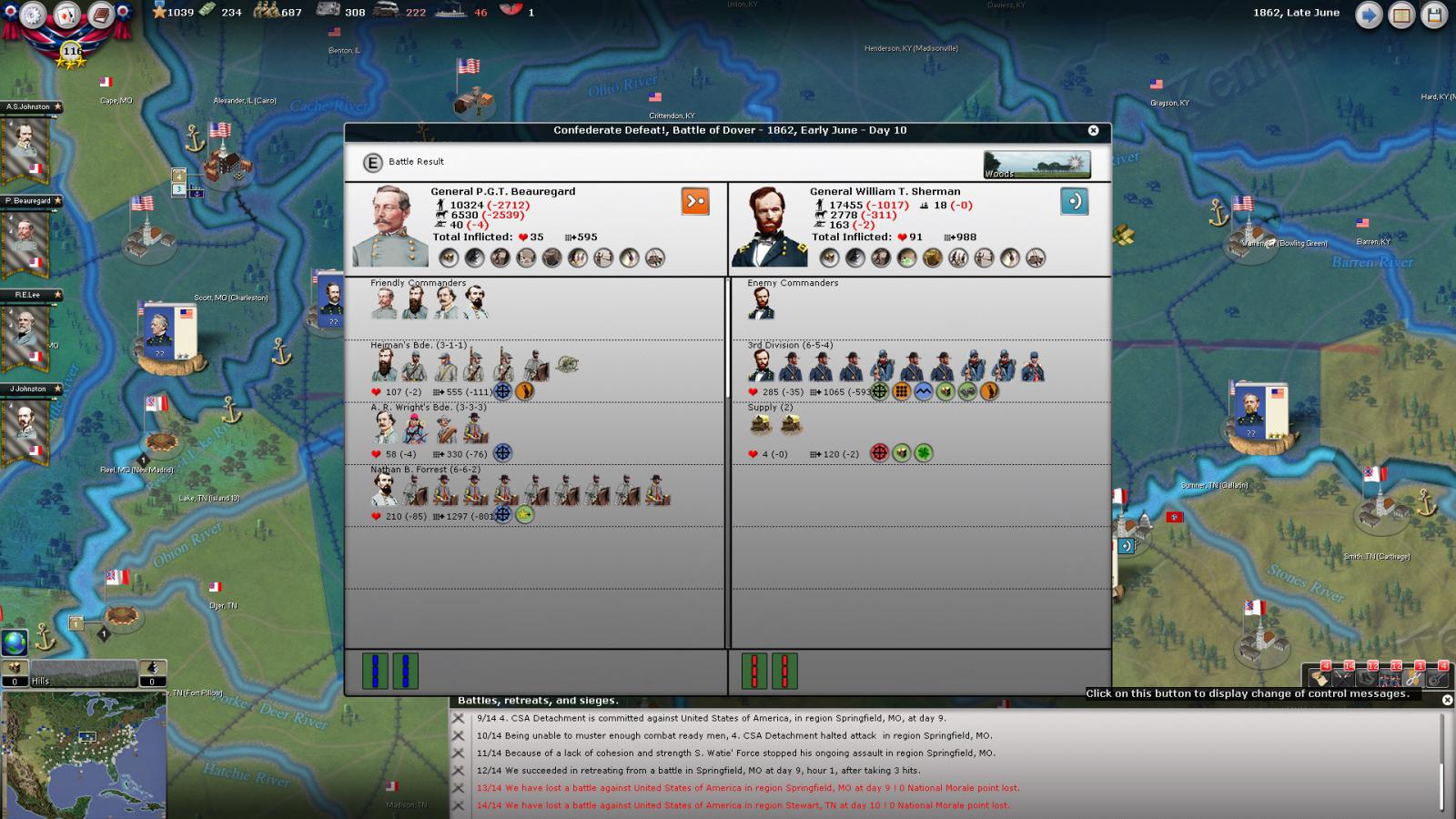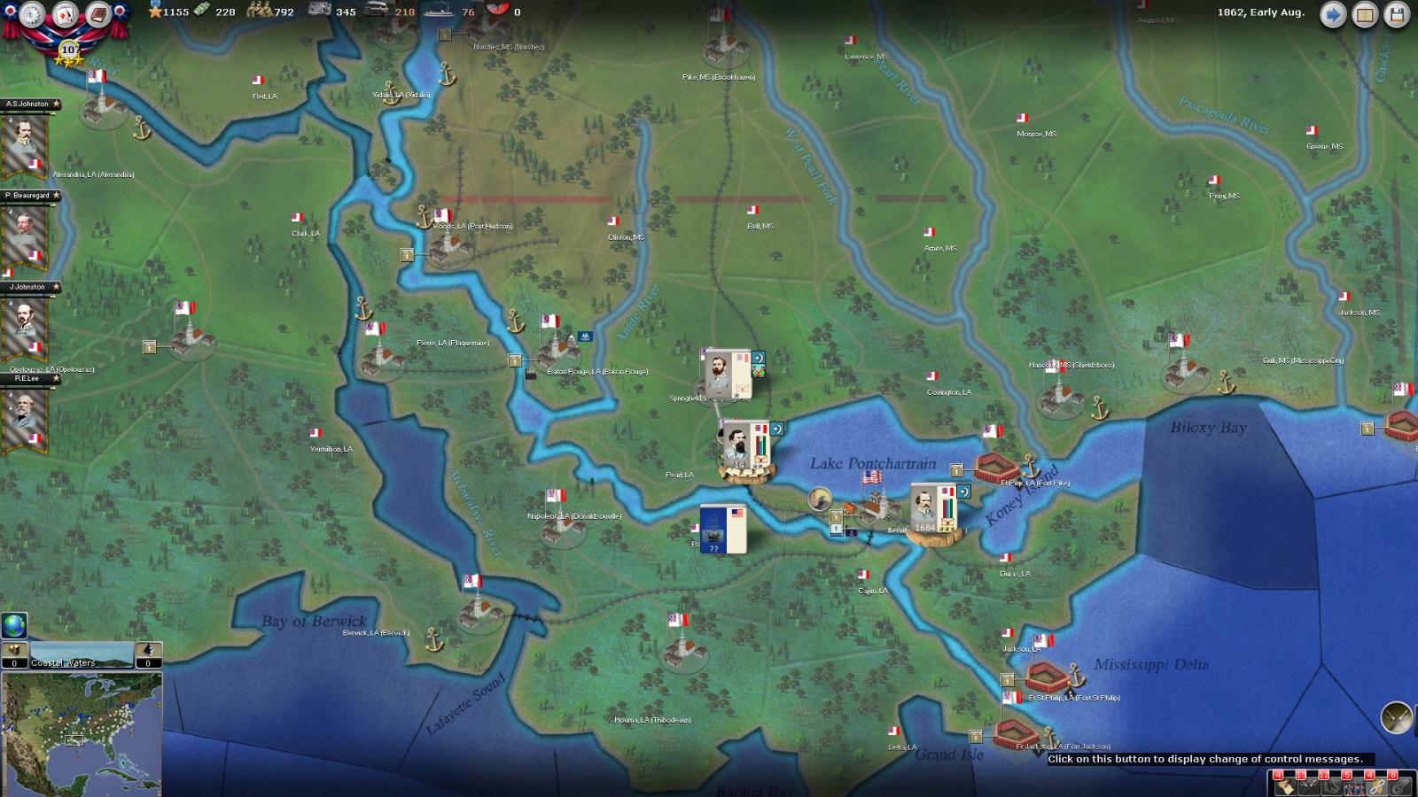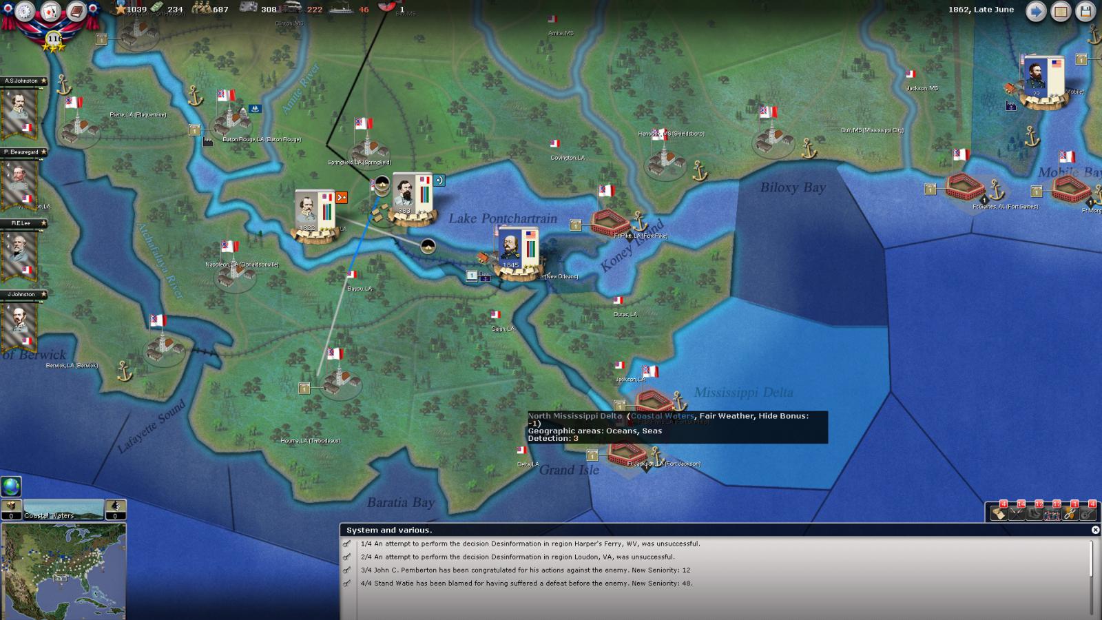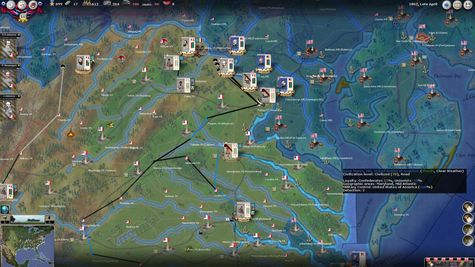 Mickey3D wrote:If I understand well the print screen of Kentucky, Polk is leading a 1111 force in Fort no 10 and you have given him a move order to Memphis. But he has a diagonal Brown line in the top right corner meaning there is a unit that can't move in his stack...