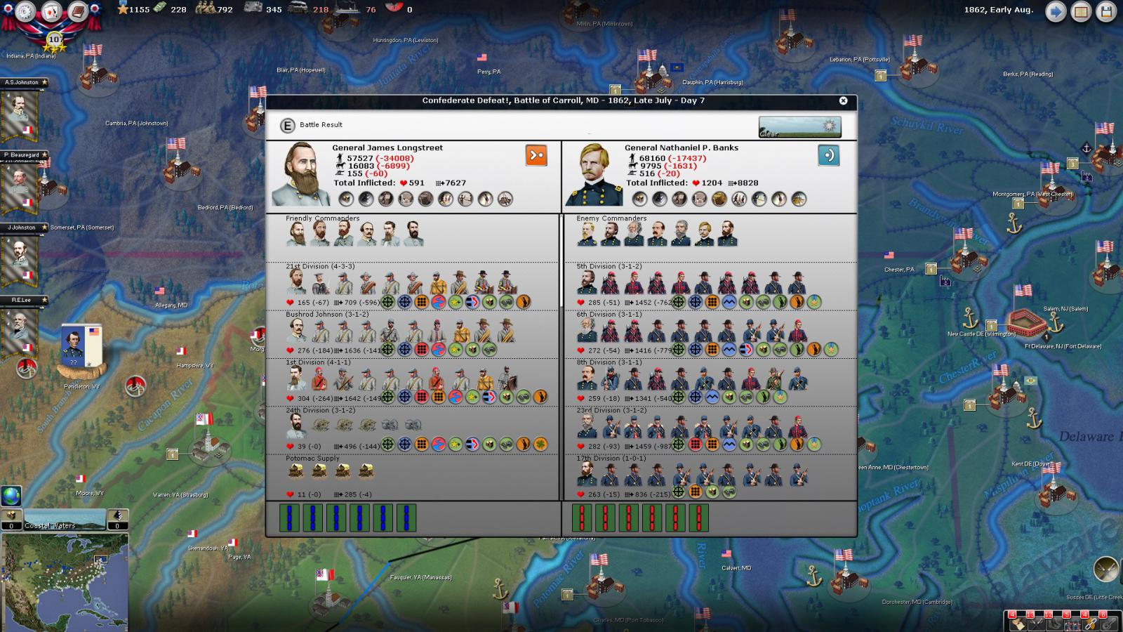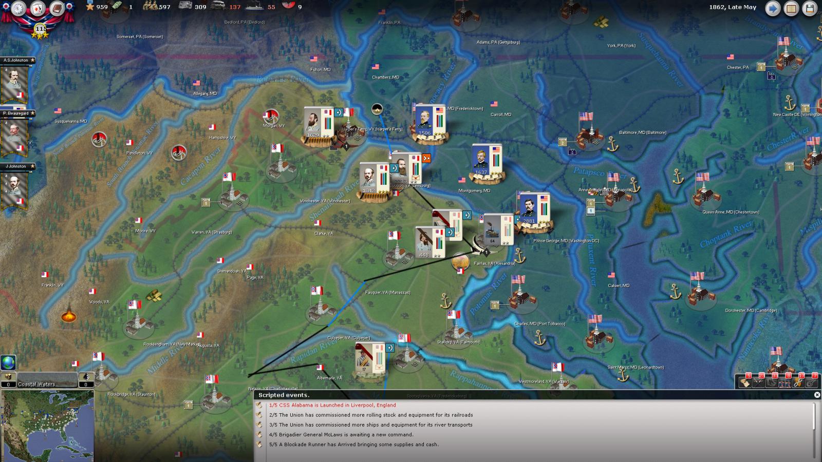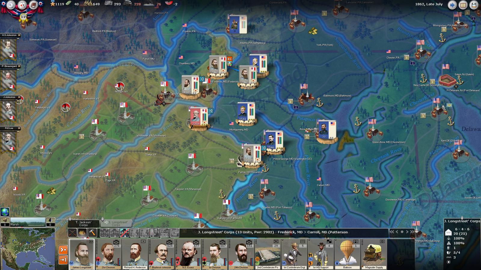 Gray Fox wrote:The attachments aren't working, so I'm guessing that the plan is for Longstreet and Jackson to do a synchronized march on Baker with Lee perhaps MTSG. Baker seems to be the Army Commander for the Union line, which unfortunately means that the D.C. defenders might also MTSG to Baker's aid and get walloped by Lee's group of much better Generals. That would leave the door to the Union capital open. Good luck!