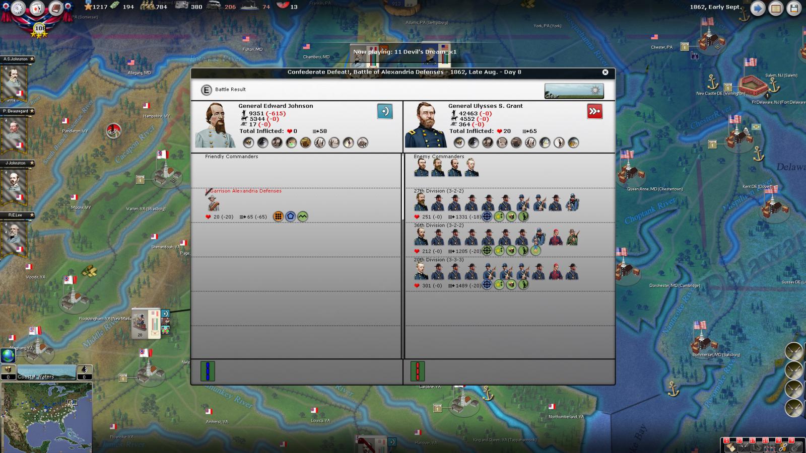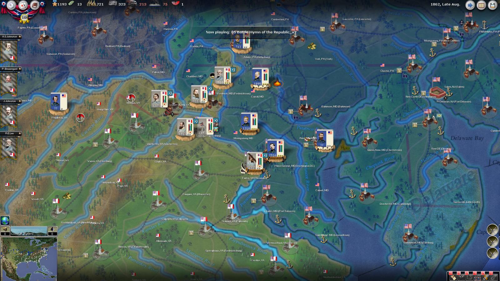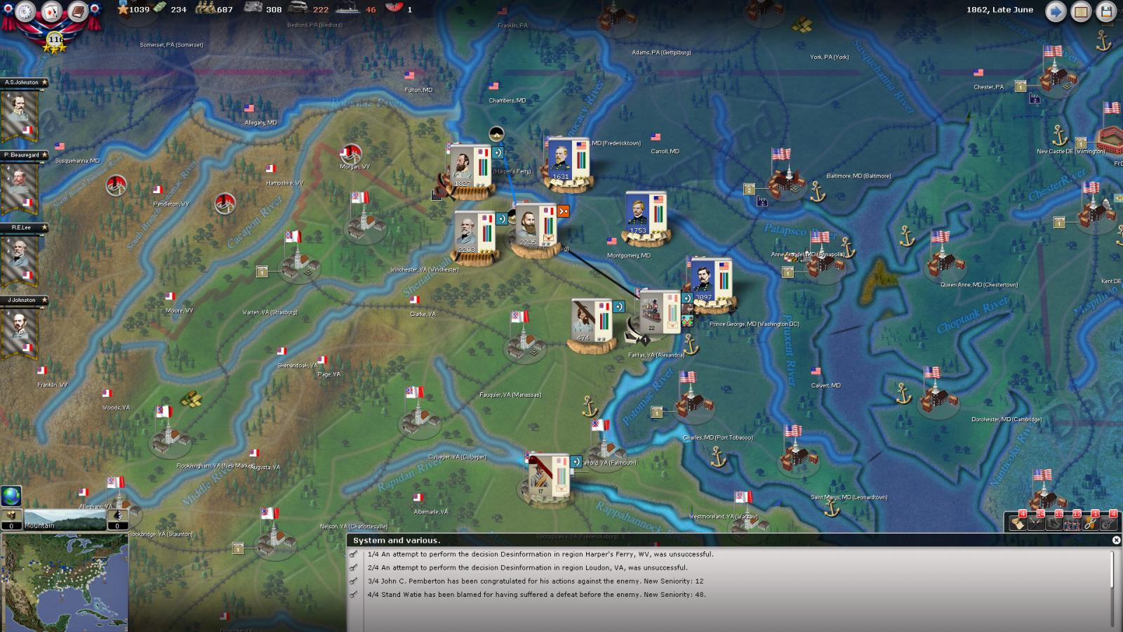 Gray Fox wrote:The attachments aren't working, so I'm guessing that the plan is for Longstreet and Jackson to do a synchronized march on Baker with Lee perhaps MTSG. Baker seems to be the Army Commander for the Union line, which unfortunately means that the D.C. defenders might also MTSG to Baker's aid and get walloped by Lee's group of much better Generals. That would leave the door to the Union capital open. Good luck!