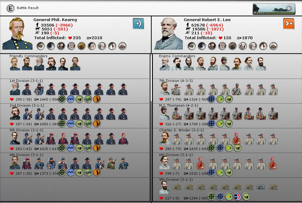 Tyler has done a very good job keep my forces at bay, but there's always room. I was tempted to retreat Kearny after his loss to Lee, but decided to keep him there just in case Lee went back to Manassas. Lee didn't move, neither did Kearny. I'm expecting Lee to attack again and I'll probably lose, but that's fine as Kearny is tying up Lee's forces.
