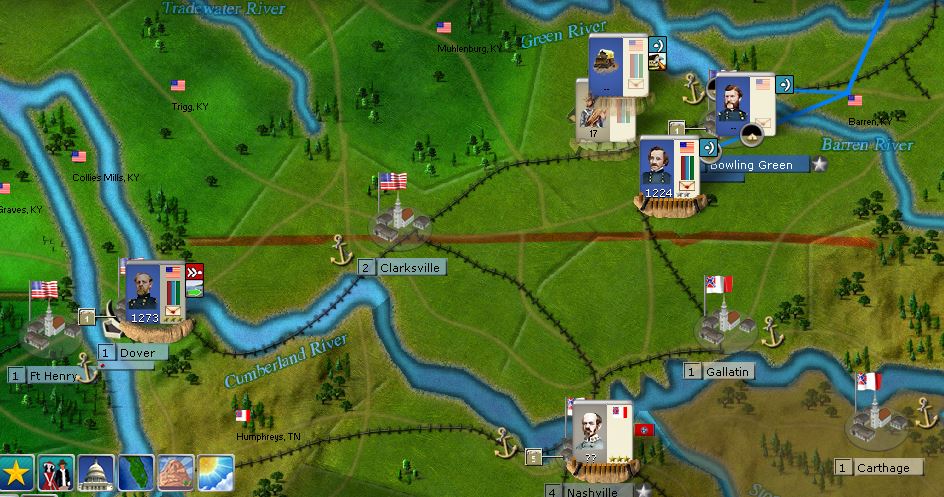 Whipple took Bowling Green (took him a while). He has 2 divisions under his command. Buell is a corp leader to Grant with 2 divisions under his command and took Clarksville and Fort Donelson. There's 2 more divisions under Halleck training up their militia/conscripts in Louisville. The Rebel force in Nashville is approx. 3-4 divisions. Whipple will hold at Bowling Green. I'm not too worried about a counter attack at Bowling Green as the Nashville force has to worry about it's left flank.
