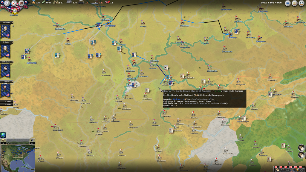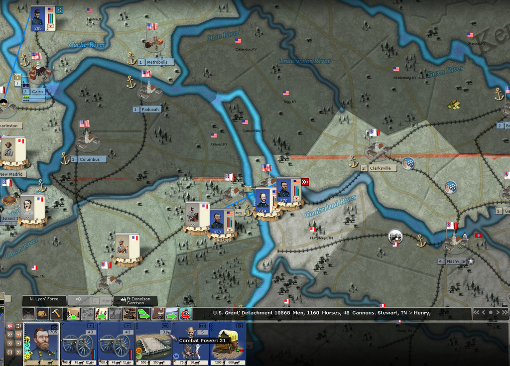 3)I find building a large river fleet to be somewhat useless as well. Not saying don't build some, but I usually stick with building 3-4 ironclads. No more. You get a free one or two? can't remember, then I just try and match the CSA's number, 4-5 total. You do run the risk of the CSA building some more and controlling the river for a bit, but that will waste precious resources and I pray the CSA players do this. What use is a navy when all they will be able to do is block some river movement? As you take the coastal regions of the river, set up some bombardments along strategic areas and throw some holes in them. Then as their ports fall one by because they built a navy and you have massive numbers, that fleet will eventually find a port far away and sit there because you'll be rampaging in mid Tenn and Mississippi.