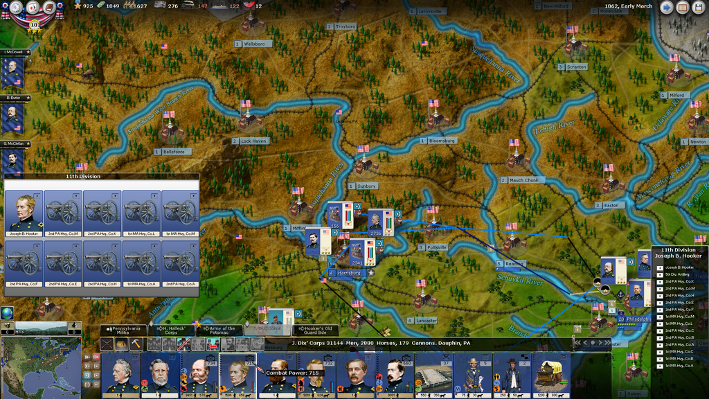 Halleck has appeared so he will be joining Little Mac in Harrisburg to help with the training. I have recruited another division in PA for naval operations as well as another division out west along with some more artillery and some support units for my future naval operation stack. I still have 300 or so conscripts so its a toss up if I would have been able to build anything else had I gone with a lesser enlistment bonus. I would have had the money, but would I have had the conscripts?