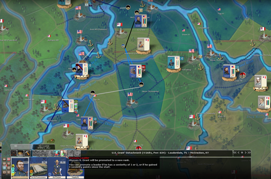 Grant is finally able to be promoted. We will lose 4 NM for this, but I really don't care. He needs to be our commander in the west right now as we have none. He will fall back on Paducah to meet Sherman and some reinforcements and relinquish his division to another general so he can take up command of the entire theater. Pope has moved from Donaldson to one region away from Nashville while half of our Louisville force has moved on Bowling Green (KY entered on the Union side BTW). At this point Exlaime is basically cut off from KY and the remarkable units you can create there. He will begin to feel the hurt from that as time goes on.