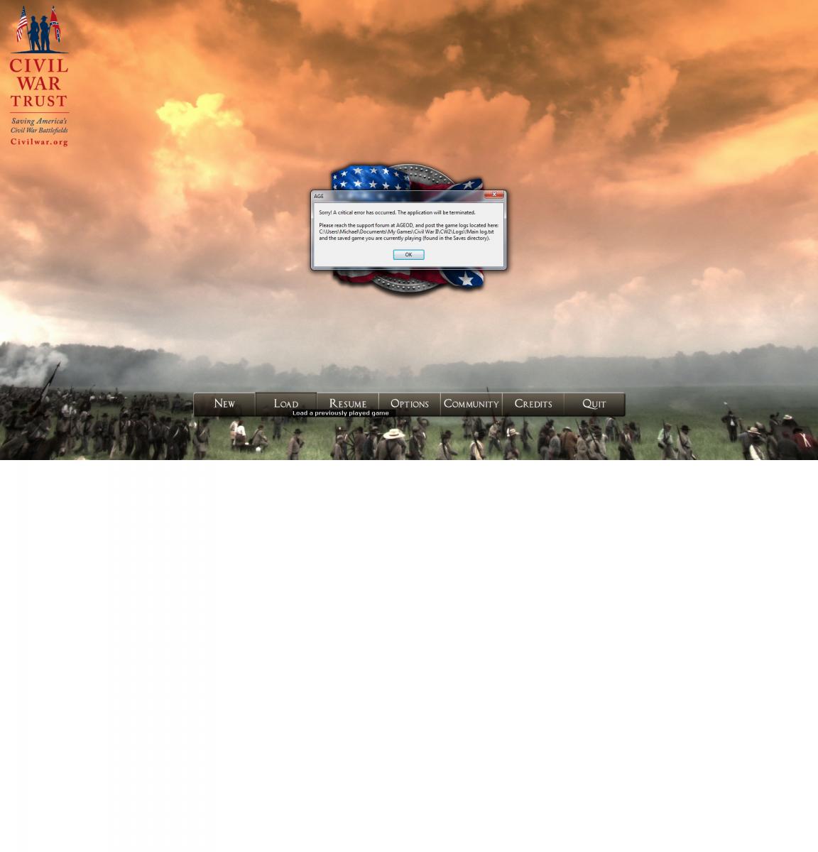 I purchased Civ War II about a month ago. The Load Game button has never worked, instead bringing up a critical error message asking me to post the game log and save files on the forum. Which I think I have done correctly (?) As you can tell computers are not something I know much about.