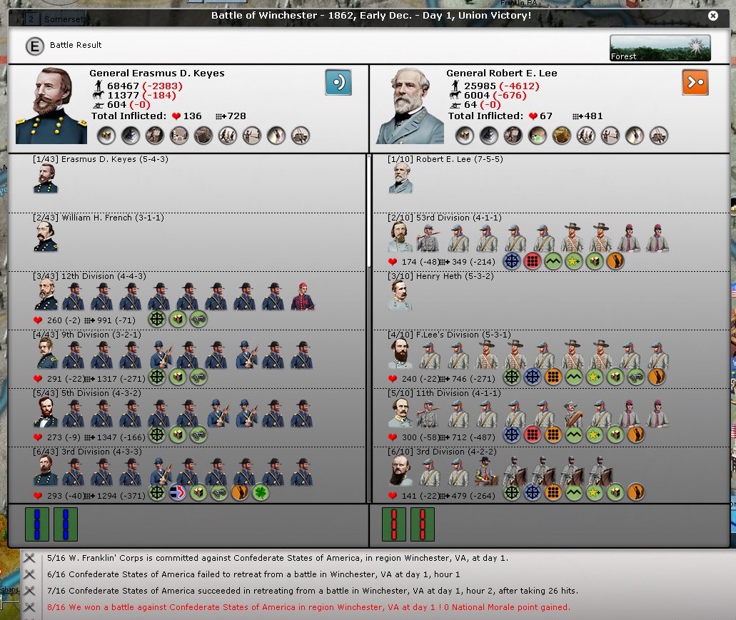 Im playing a big campaign playing Union side, patch 1.02 applied. It is late december 62 and this battle took place in Winchester.