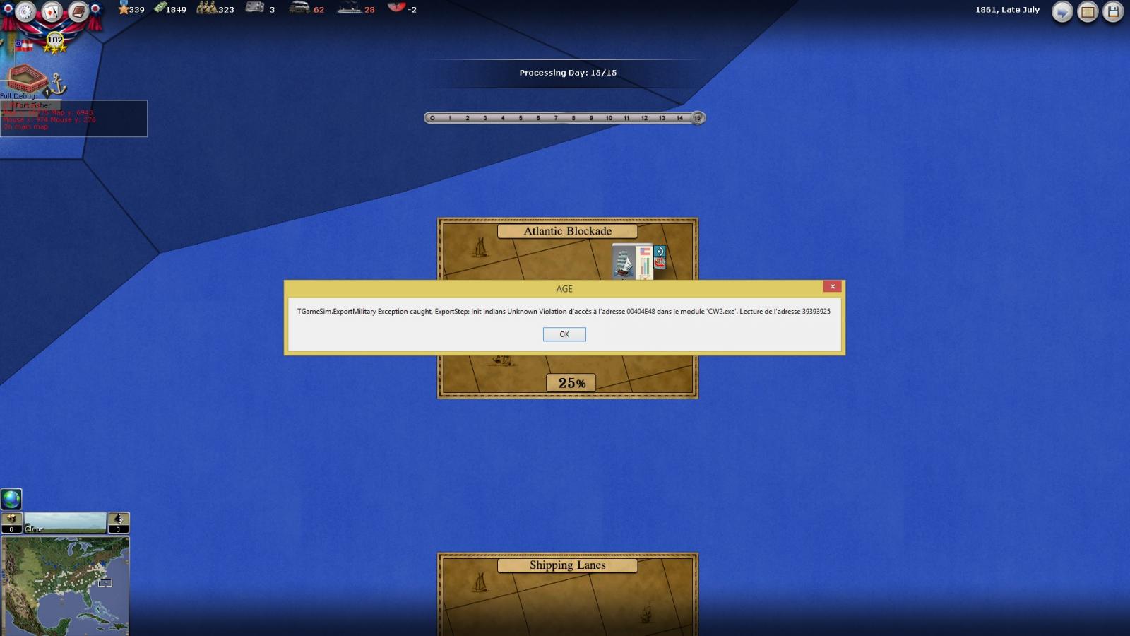 At conclusion of turn resolution this error occurred ... about 3 in succession, then "several errors" warning, and finally, crash to desktop.