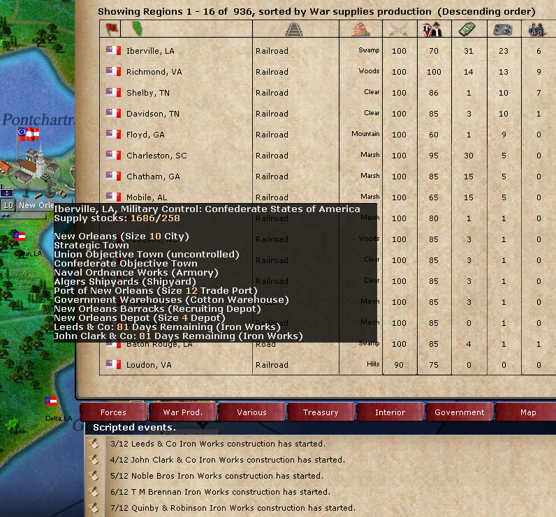 Prior to the picture I ordered both of the available industrial options in early June of '61 to build ironworks in coastal cities and in Tenseness and Georgia. As seen in the picture, these buildings started to produce WSU the very same turn that their construction is started. This equates to six free turns of WSU production at the most crucial point in the war, providing close to 300 free WSU. Fixing this would slow down the first year production by a massive amount for the CSA.