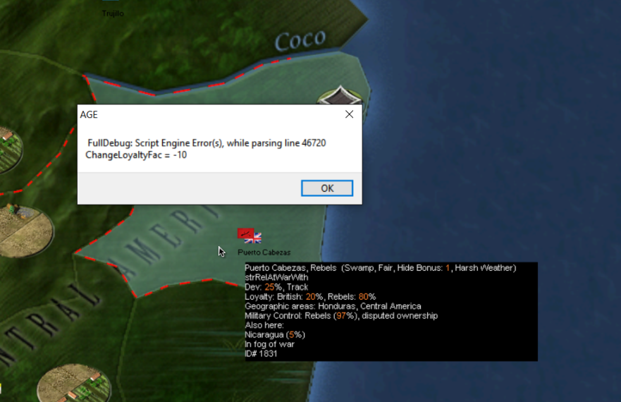 Here is a screen cap that shows two issues- a script error and a incorrectly displayed tool tip string. In the past when you hovered over a province it would show your current status of neutrality or at war. Now it just shows the string.