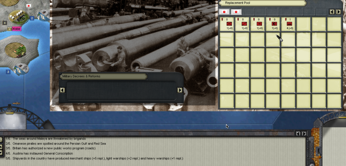 This pic displays Japanese Shipyard production- both as a notification, and in the replacement pool. Issue arises in that I have acquired Heavy Warship Parts but nothing is displayed in the Replacement Pool. Is this a function of the fact that at this time Japan has no Heavy Warships, at least according to Technology and what I am currently able to build? Or is an image missing?