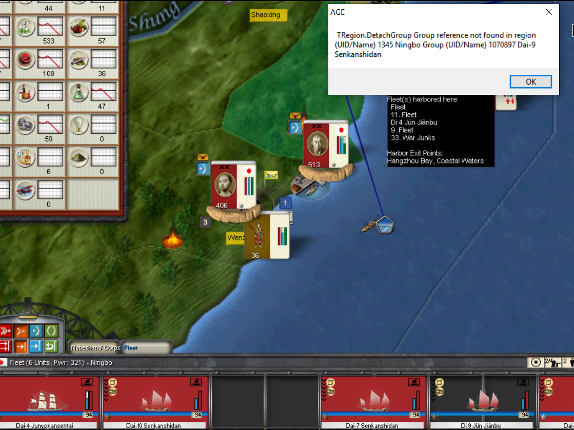 - At some point after my first failed conflict with China; in a grab for Shanghai- they offered Peace and I accepted, as it was not hard to see the handwriting on the wall with a 5k stack heading my way in the early 1850's; and they must have granted me Supply Rights, which I've been availing myself of during my current war with Tonkin, and in the region of Ningbo I've been using that small harbor with apparently everyone else and their uncle; and while trying to select a unit this popped up, and you can see two blank spaces in the unit bar- those units disappeared, but reloading the save everything was back as it should. I think there were just too many units in that location, and something went bonkers upon unit selection:
