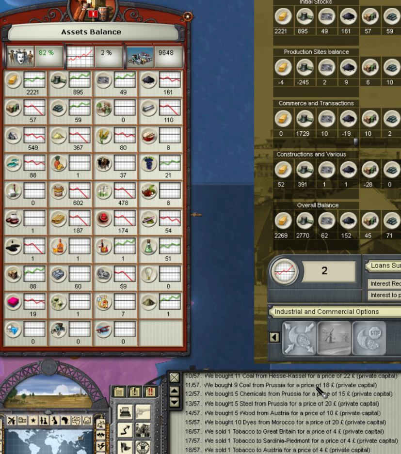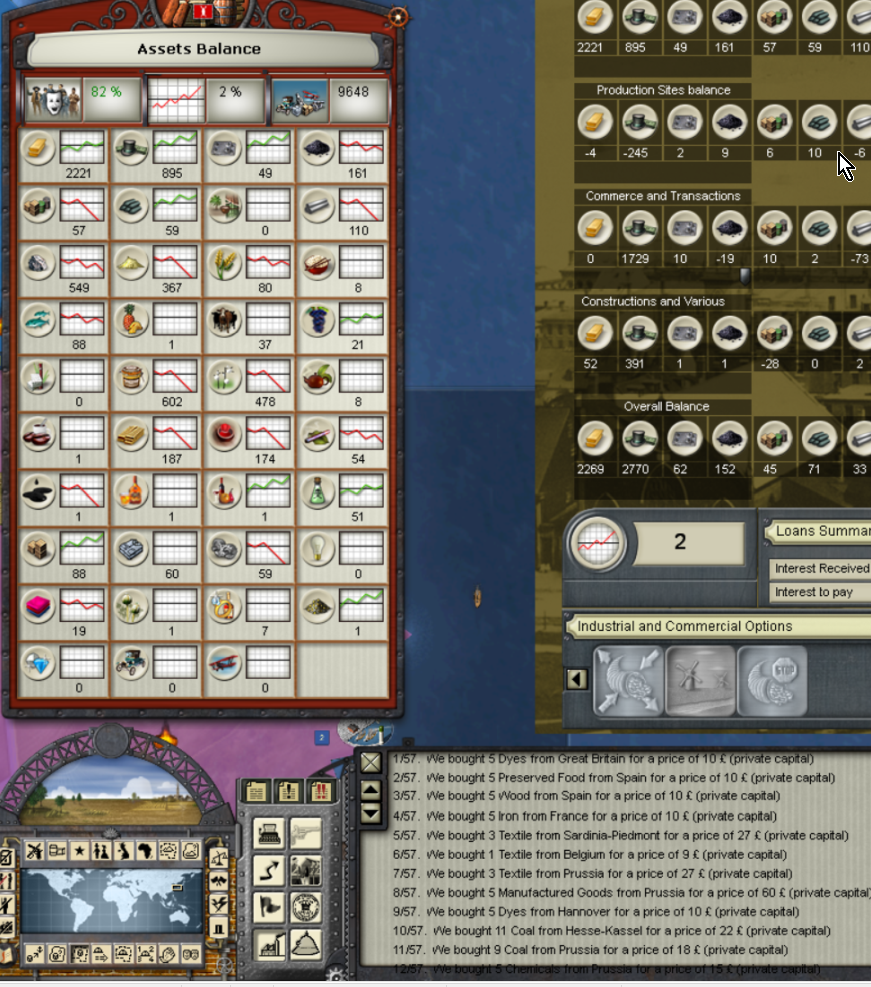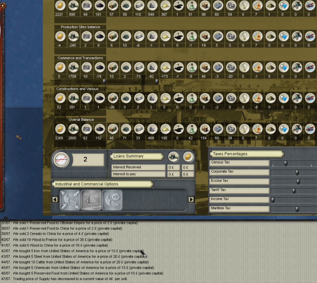 Random changes to Trade requests: every so often I'll find that I bought a quantity of an item that I did not request; usually happens to a max of two items in a variable number of trade areas. But this turn Early January 1857 as Japan, for no apparent reason I find that I had bought from 20 locations including many items that I had no need of. In this time frame the only items that i was consistently buying was Steel, Manufactured Goods, Fruit, Supply, Ammo and Cows. This particular turn I believe I was only buying Supply, Ammo, Goods and Steel. As you can see many of my purchases I had zero need of.