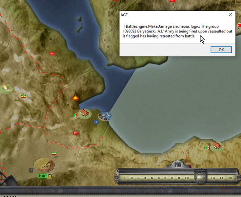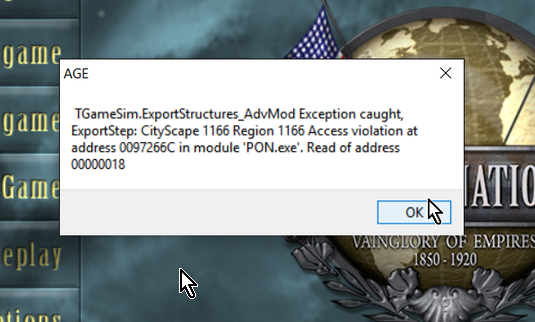 Good news- was able to continue, so it was not fatal to the save game (had prior turns-12 saved; so I could have continued anyway). Bear in mind, I'm running this in de-bug mode, so much of what I'm encountering most likely would be transparent in normal mode. Now if I only could figure out what to do with Japan- both arms and legs are strapped behind my head with literally zip for diplomatic and colonization options available at this stage of the game.
