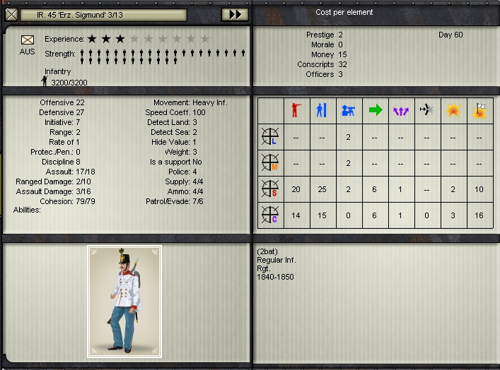 And in the current scenario, at the start, the best infantry Austria has got is its Austrian, Hungarion and Polish Landwehr, which are of the 1850-1870 style (more efficient weapons) and not of the 1840-1850 style. See here for comparison an infantry unit and a Landwehr unit in January 1850: