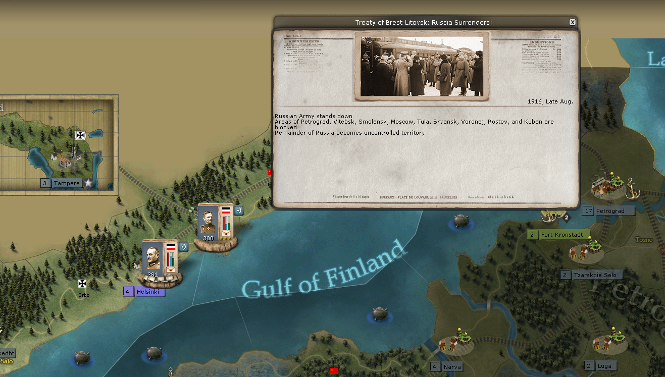 In this WW1 game, the Treaty should treathen the player when the germans are coming, even if the morale is not so low... It should be a Sword of Damocles. "Russian player, you suddenly are in peace with germans! (but you lost the WW1 game), you can thank the Party! (Lenin). However you can continue to play and then must fight russian people instead of german invaders: buy R.U.S.!" :( :D