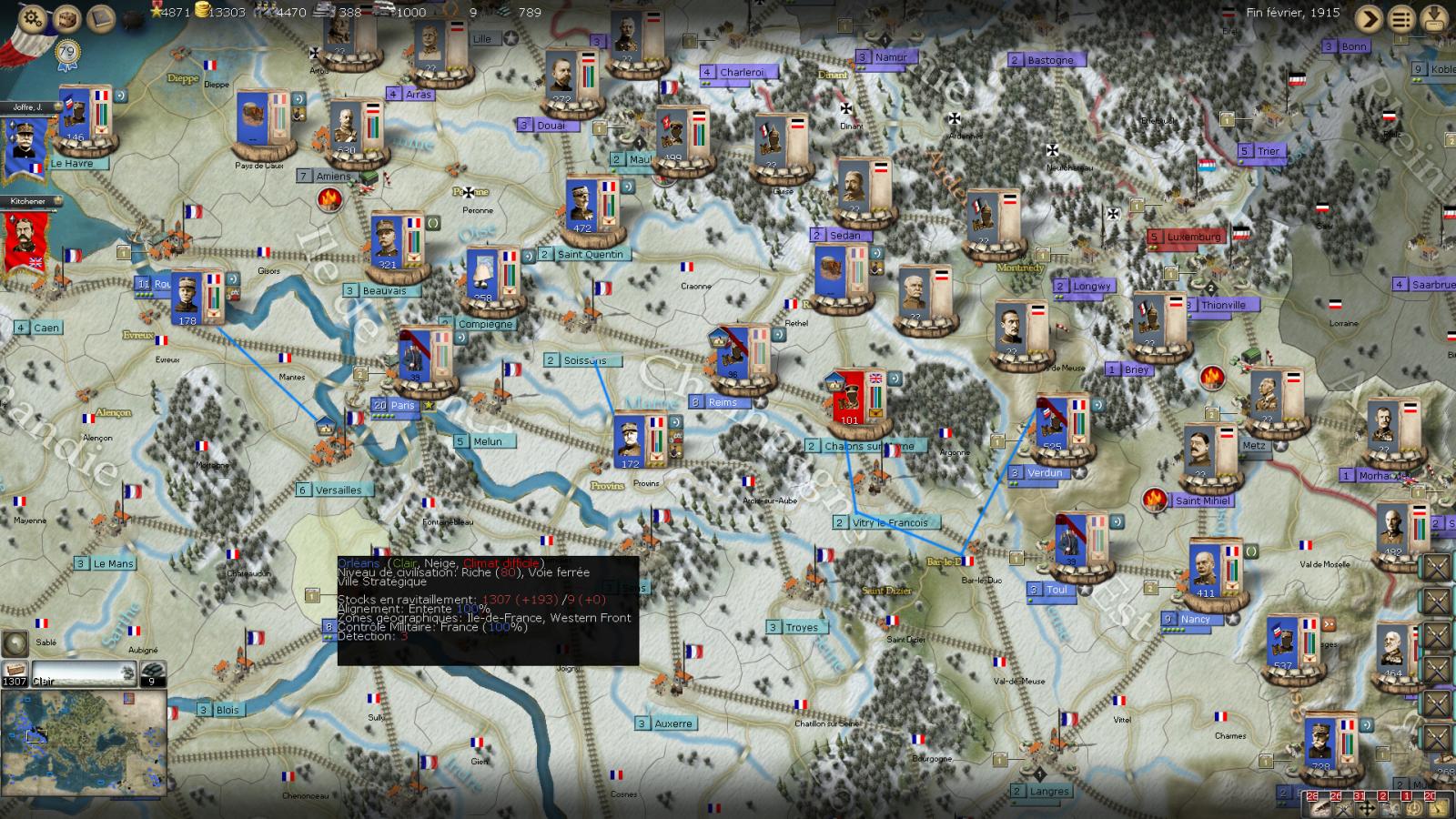 Hardly any troops left in France (look where their strongest stack is, at their extreme right flank), I exect due to suicidal attacks on Metz. What I thought to be British troops (in Flanders and at the centre of the French "Front") are actually mostly Belgians under British command.