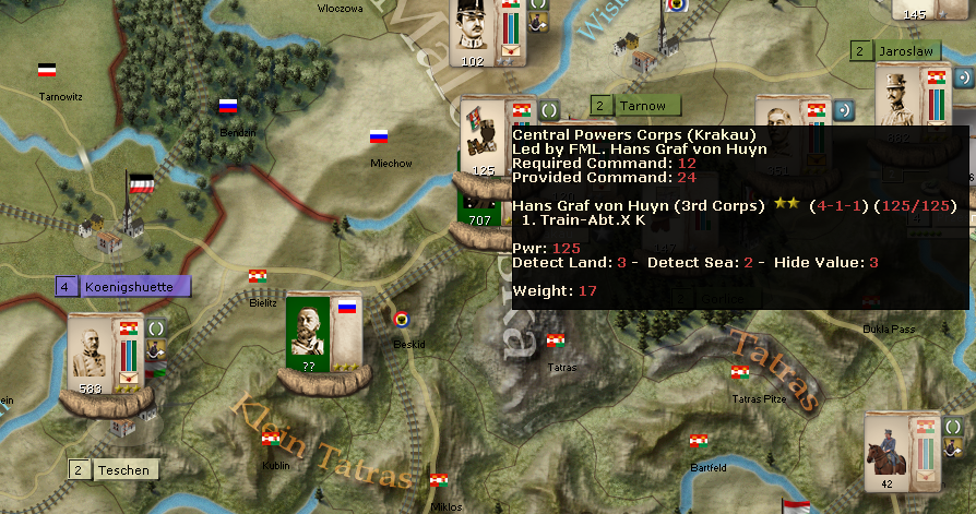 BUT this didn't happen in my example above. My units withdrew into a region with a besieged structure (the besieging force had been there from the previous turn). Even though there was a choice of THREE regions with 100% friendly military control. Looks like this needs patching.Now I have to try and get my two corps with 250 combat power away from a Russian force of 707 combat power. My Austrian force looks like a ping pong ball here...