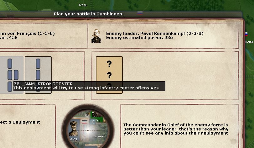 I attached two screenshots showing text glitches and a description I don't understand. I guess the text errors are easy to find, but what I don't understand is the text below Rennenkampf: why is the enemy leader (->Rennenkampf) better than my leader?