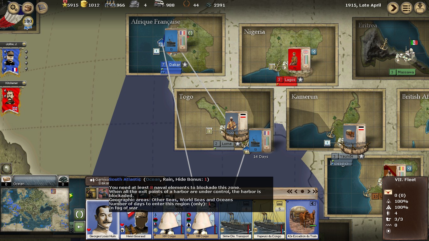 Oddly, for me, the distant unload seems to have worked fine. I took the file you uploaded, and ran the turn. Humbart and his 2 corps are now in Togo, and the ships are still in the Atlantic. The troops distant unloaded from the Atlantic, and so made it. It takes 84 days now to move back from Togo to Africa Franciase.