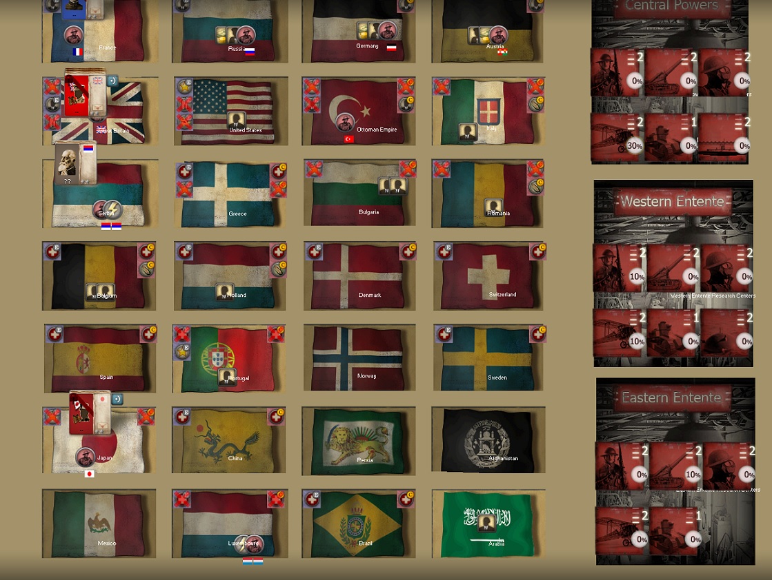 Here is a screenshot of current research levels. Note how much further the WE is in the realm of tank research. That's due to the playing of the JFC Fuller card I showed a screenshot of. I'm hoping for tanks sometime soon!