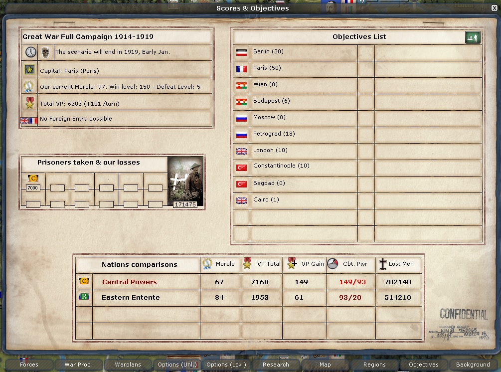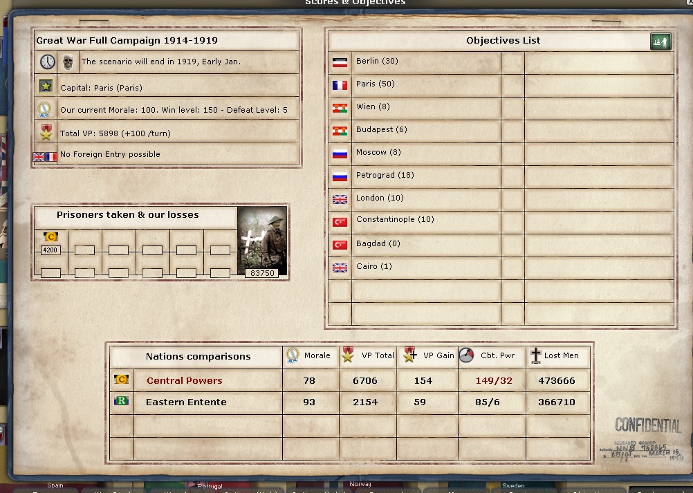For some reason some pictures will upload and some will not. I'm not going over the limits. It's just a "Failed false error" on some. Here is the objectives screen. As you can see, CP morale is now 78. At some point National Morale will make their armies start failing.