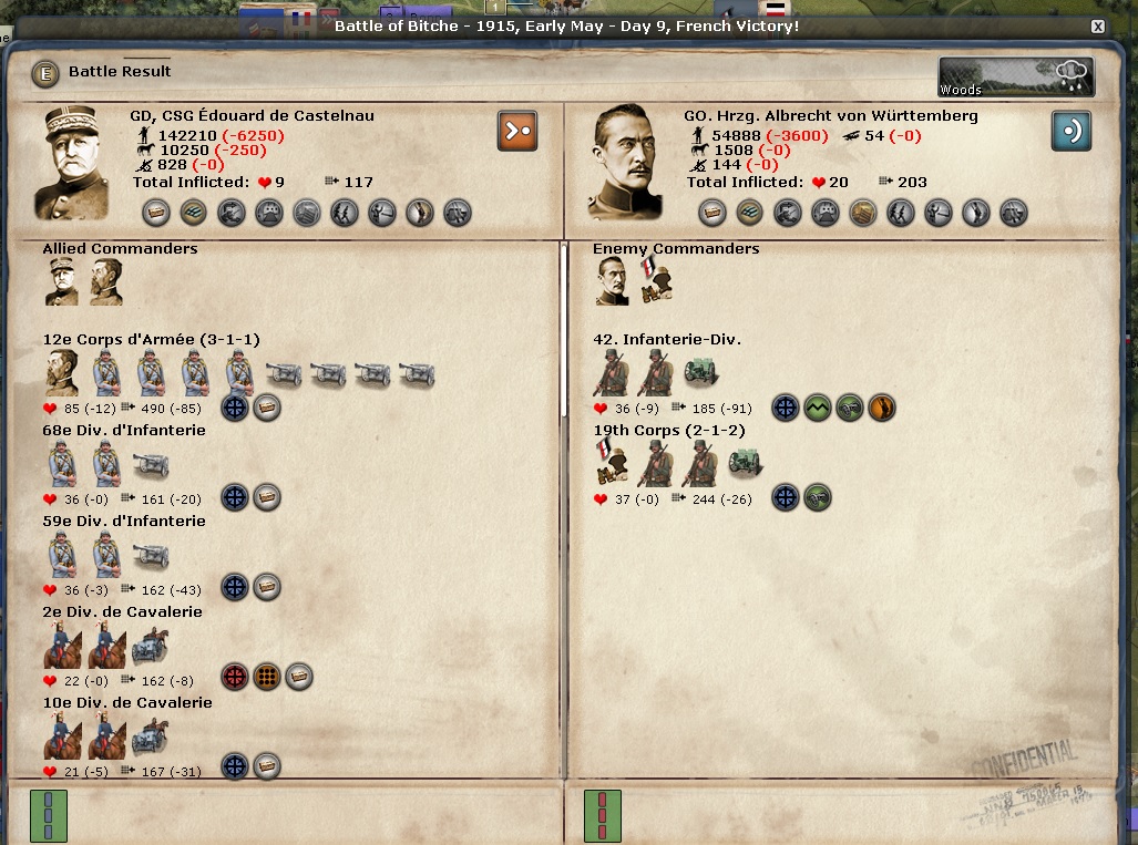 As you can see, General Wurttemberg's army has lost 200 power (on average). I can play Chlorine gas 2 more times for special advantages, and then it normalizes at a lesser effect due to armies being prepared for such attacks. Game note: Using Chlorine Gas loses 1 National Morale each time. I'd imagine to the horrific nature of the attacks. The citizens of France and Great Britain I'm sure reacted in shock once they started hearing about the effects.