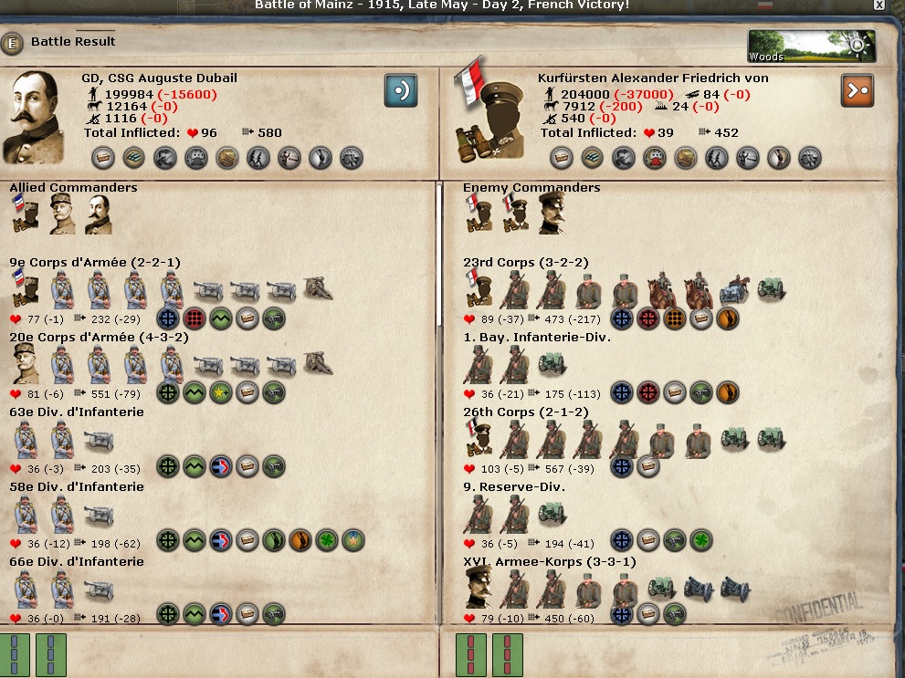 Additional reply to your concern. The Germans took the Moltke Plan which meant they would focus on Russia. If they had implemented a plan that focused on the West, I'd be very hard pressed to win anything! Even so, almost none of my victories have been knockout blows except for some of the naval battles. I don't think I've received any boost to National Morale for a land battle, but I certainly lost some when I attacked into Mulhousen (in turns not pictured in the AAR).