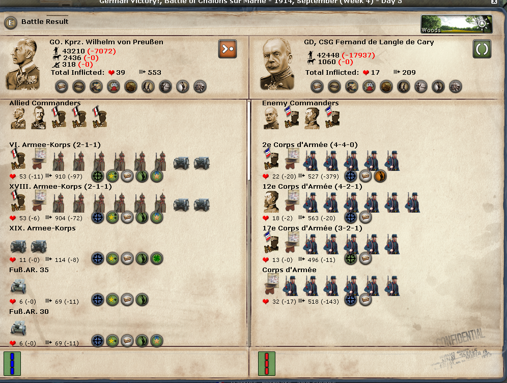 Lets discuss the East - it looks like the French tried to relief the siege of Verdun - but got beaten back up by Moltke ;-D in the Southeast the French were somehow sneaking through my units capturing Mulhouse - that sneaking through units happens IMO way to often in TEAW in Vanilla and the mod - I hope it will be fixed somehow - but it does not cause any headaches for me, as I will send my most Soutnern 700CB stack to destroy that small force (340CB) and hopefully gain lots of NM by completly wiping it out the next two turns - if it cannot sneak back again through my two stacks ;-D. Talking about sneaking - The French were able to sneak an army from Rethel - through Chalons sur Marne to Vitre le Francois - that army was very low on chohesion and starving - so it would have usually neded two turns to walk there - plus I had three German armies and corps in its way that hit it twice - so how come I did not wipe it out? That actually is my biggest critic right now of the game - armies and corps can retreat through provinces that they could never cover through normal movement passing by 2-3 armies and corps...that can give me quite a headache if I want to finally wipe out and smash the surrounded French and BEF...they could even though surrounded still escape...Finally the big French stack moved from Nancy so I can attack that fort this turn too. My opponnent seems to leave planes back in provinces - I captured already one unit in Belfort and will be able to capture a second in Nancy...I will send two corps to Nancy which is completly undefended - so I have 1100 CB againts his 1500CB if he counterattacks - at the same time I send Moltke to the 500CB army so I have realiable MTSG if any of the three provinces will be attacked ;-D. Belfort has one breach already - I hope I can take it next turn - that will be another hit to the French NM and a gain for me ;-D