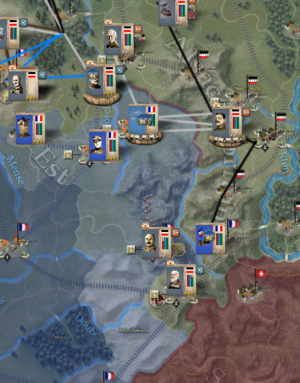 Lets discuss Eastern France...it goes perfectly there - the small army at Mulhouse was cut off and nearly destroyed - and will be destroyed next turn - giving me more NM and Belfort has surrendered - also the counterattack at Val de Moselle failed and now with my GHQ in playce I will have realiable MTSG for three provinces - which should make it impossible for my opponent to take back any province - in his counterattack he lost 500CB for now ;-D I will siege Nancy, Verdun and Epinal until they surrender so I do not weaken my armies and gain the NM ;-D I am sending more units to Moltke as he will MTSG them in the two other provinces...so twice as useful and as soon as I have taken all forts I am in a very strong defensive position - plus I conquered another unit of planes - I dunno why my opponent is leaving them unguarded? ;-D Units that I do not need to defend here, I send to the West to speed up the mob up there...