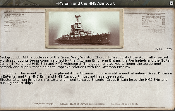 The battles and a good event -obviously GB would not be prepared for an invasion of Egypt - they rather seem to bring in any unit to France - so they want to buy time. But that will only strengthen the Ottoman fleet and buy us time to get countries on our side diplomatically. The sooner the Ottomans join the war, the sooner the masscre of the Armeniens will fire - that influences a lot of countries to get closer to the Entente - so acrually a better fleet for the Ottomans and a dealy in their entry is helpful to the CPs ;-D