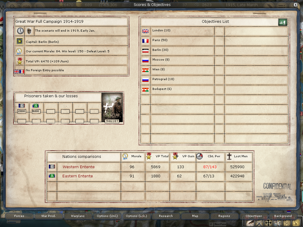 The Overall Situation: The WE has 600k more losses than the CP. We need to take a few more objectives from Russia to get their NM down.