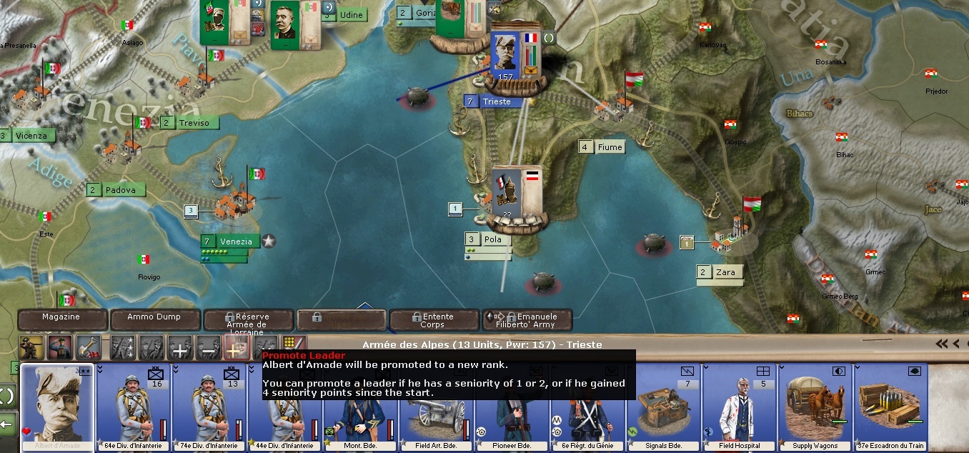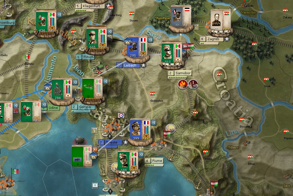 I keep fortifying Samobor with more troops because of the many big battles we have had there. The troops that took Pola move to Fiume and then eventually North to support the Samobor formations.