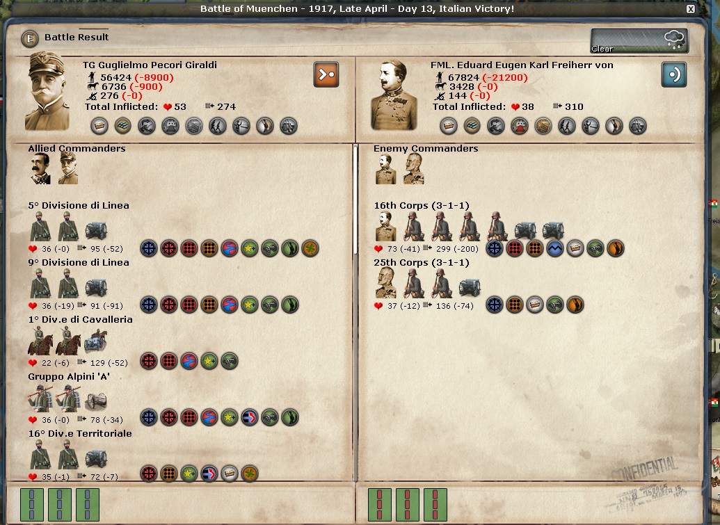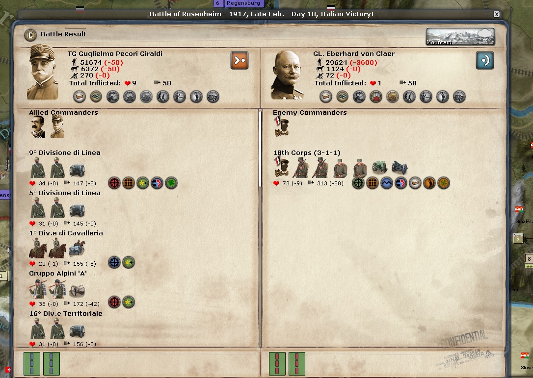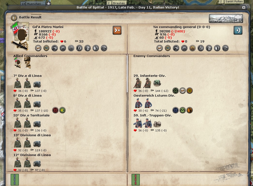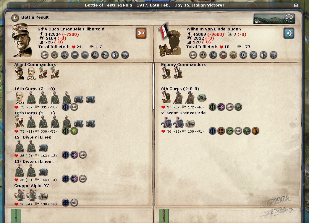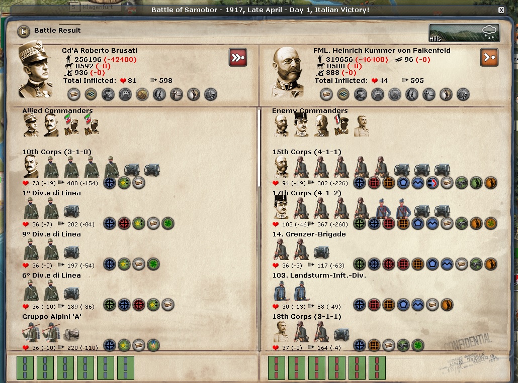 Any discussion of the Italian Front begins and ends with Samobor. Brusati is the overall commander there and he is a 2-1-1 general. I would think he would get huge boosts to his stats because the CP keep attacking from Zagreb over the Sava River and they keep losing very big battles. Those battles are sapping the CP's will to fight.