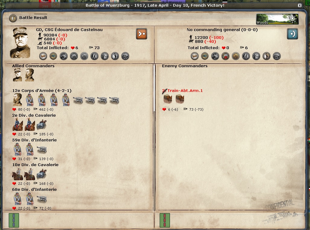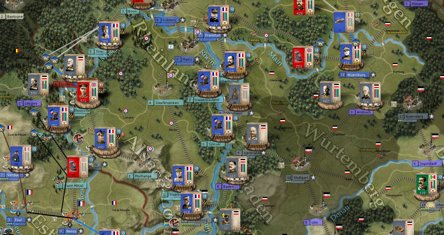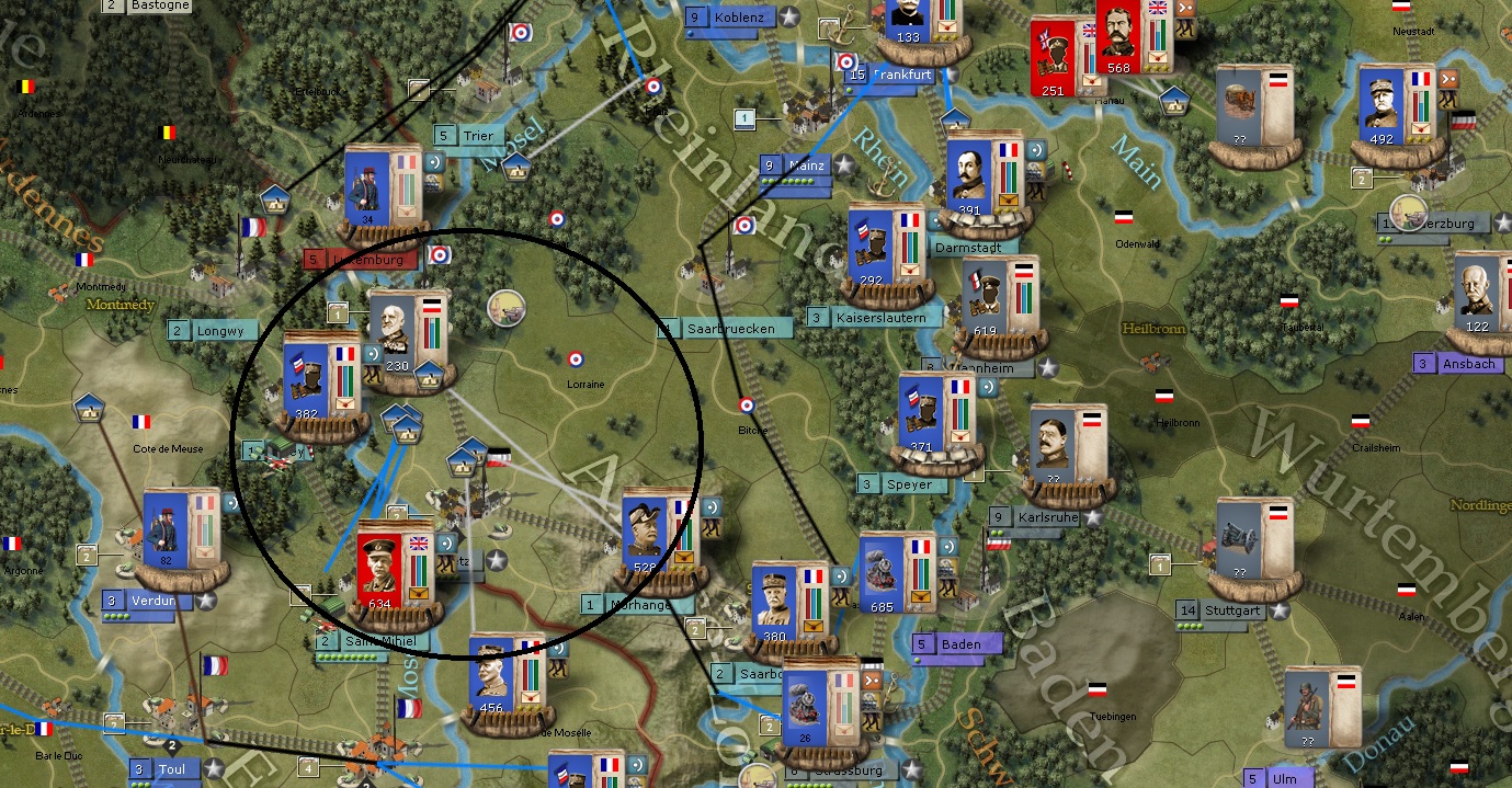I have full breach on Kassel and the formations there will assault this turn. I have put a lot of formations in Wuerzburg to offset the two German formations to the South. Those German formations are very large and the longer I can keep them down there, the more Foch and the Kassel formations have to force a corridor to Berlin.