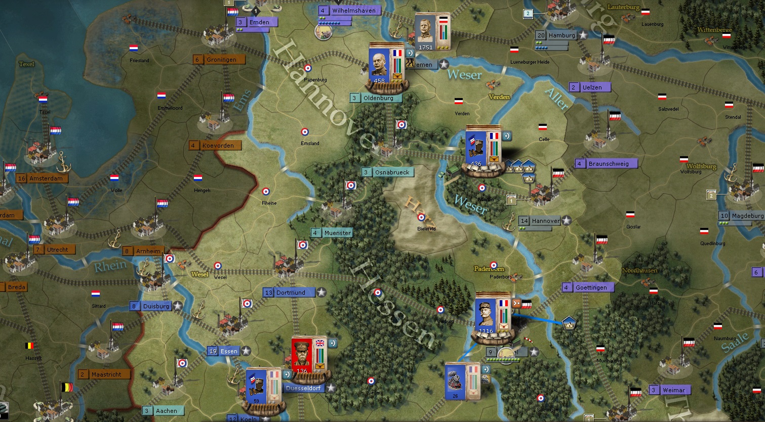 Hannover will be attacked this turn. I have about 1600 power in units opposing Von Boehn in the Far North in Oldenburg. Foch and one other formation is going to break off from the Kassel siege and start pushing towards Berlin and setting the stage for taking Goettingen. An air formation of two squadron will move with him.
