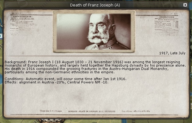 Merlin wrote:I'd just ended my reading of this a couple days ago at Early June, '17. I'd forgotten about the Franz Joseph event, so... very well played. I generally have difficulty wading through AARs written as novels, and I very much appreciate your matter-of-fact style. I try to write mine the same way.